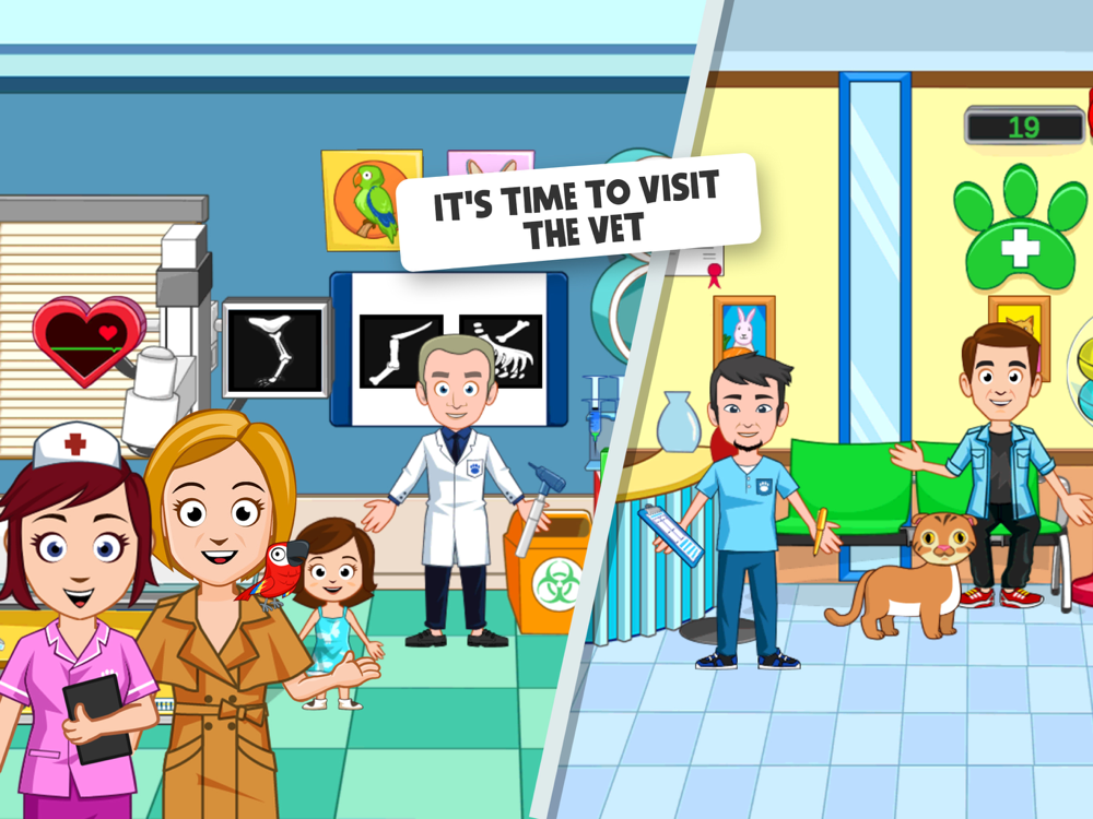 Chose who you want to be, play animal games and have fun for hours! Visit Pet Salon, Pet Store, Animal Shelter and check all the rooms for more fun. Be a Vet a play vet games! Dress up all animals and puppies in cute outfits. My Town World of Pets has many lovely animals you can take home!