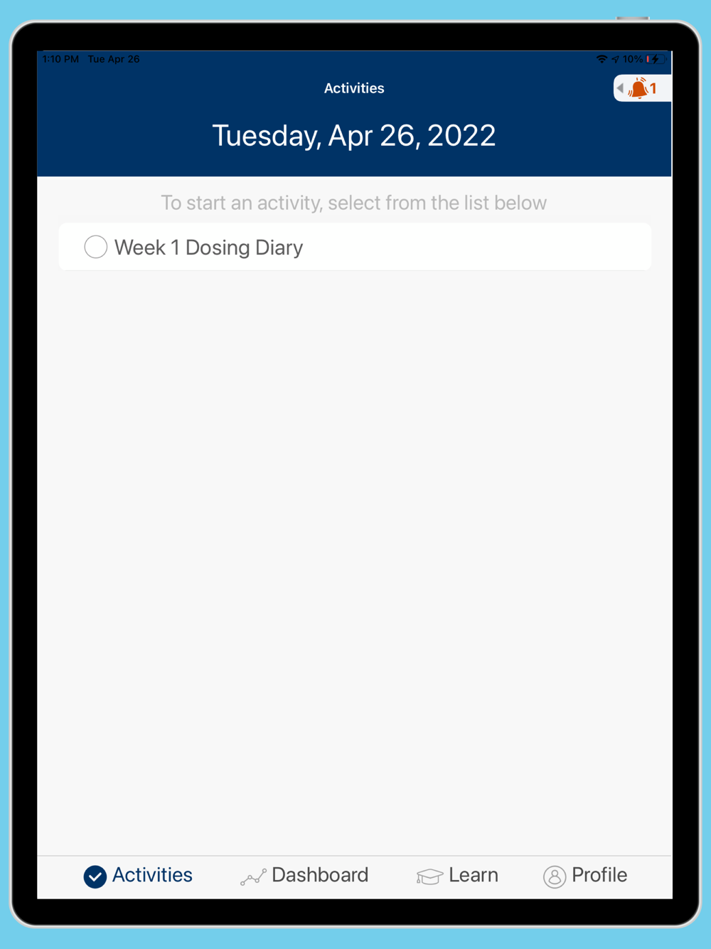 While using this app you will be asked to complete study related activities and tasks. Activities you may be asked to complete can include completing your dosing diary and performing a Telehealth call with your study doctor.