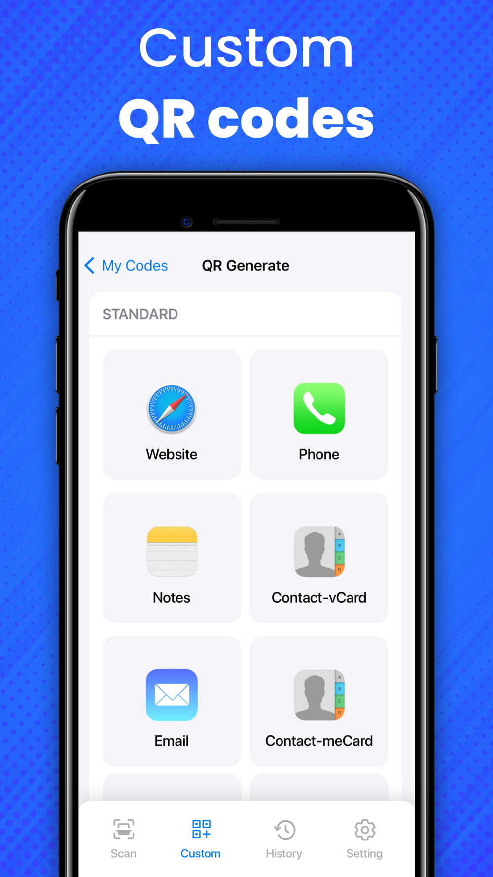 - Create your personalized QRs for Email, URL, Phone, Messages, vCard, meCard, Text, and more.