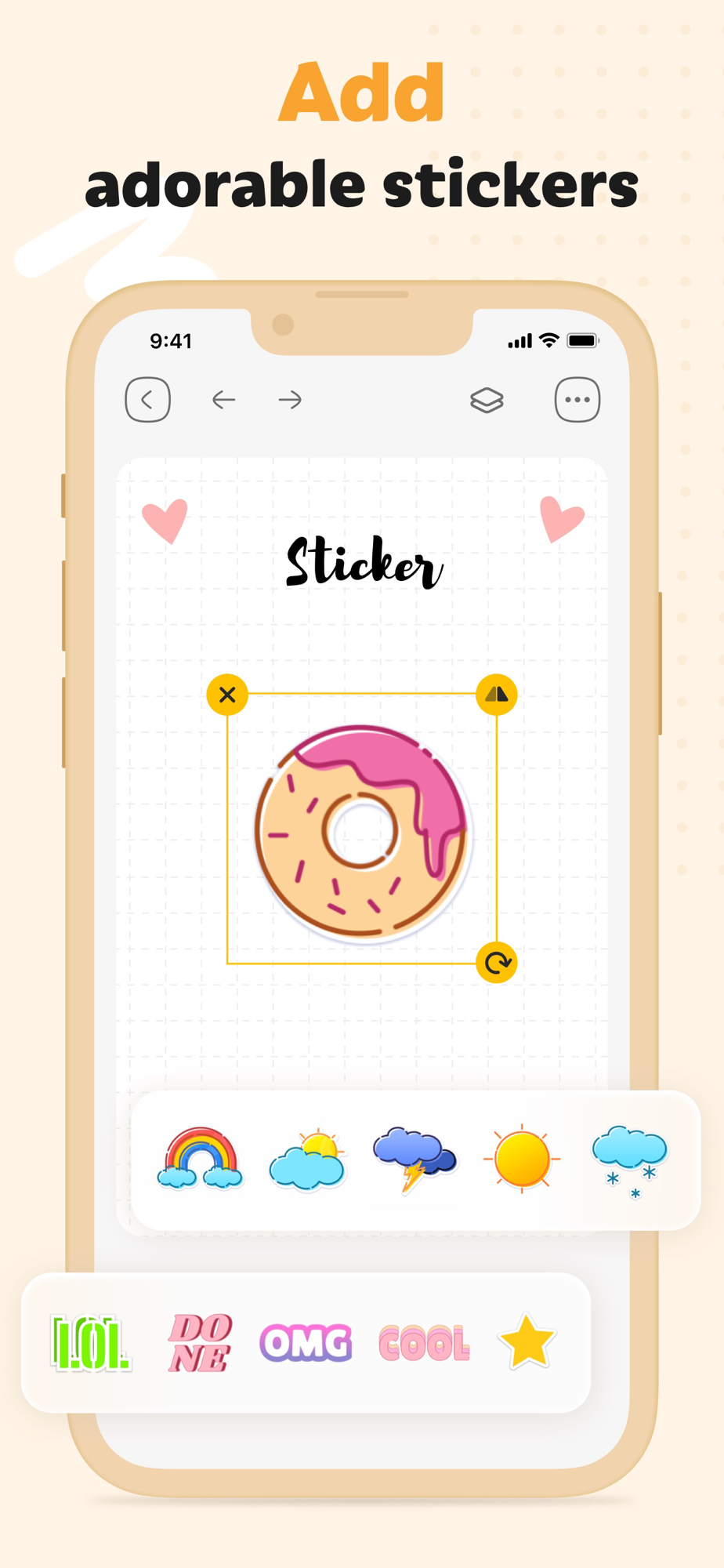 Use a variety of colorful, cute and creative templates. Try incredible page designs, stickers, brushes for a neat and pretty handwriting. Give your every page a unique style or create one distinctive look for everything! Dive into this magic world of bright colors and vivid imagination!