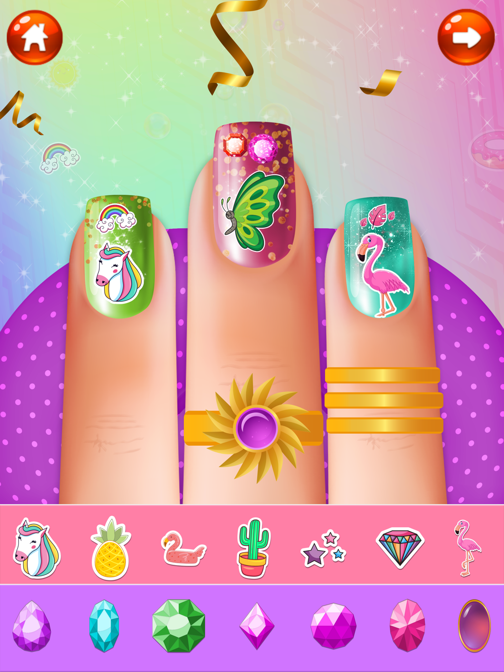 Choose the best manicure design with amazing unicorn nail stickers to be applied on the hand to make it look cute and stylish in fashion games. Once you are done with applying cool fashion stickers, choose all the shiny rhinestones and diamantes to be applied to your fashion nails art in unicorn games. Give a shiny and glittery look to your hand with rings and fashion accessories for free girl games in this unicorn spa salon game. Get lots of different rings and bangles from the jewellery collection of your makeover style corner and create addictive and beautiful designs in a unicorn nail salon game for girls.