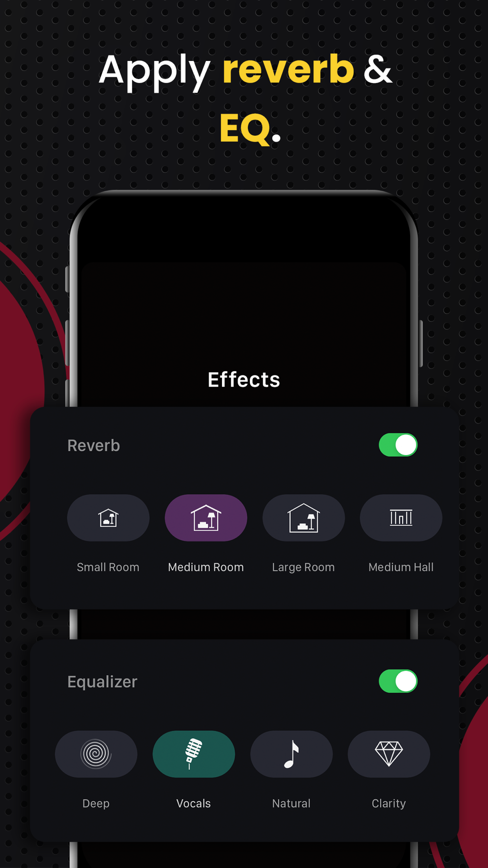 Enhance the richness and depth of your recordings with advanced settings like reverb and equalizer adjustments. Shape and mould your vocal performances with precision, and witness your creativity soar to new heights.