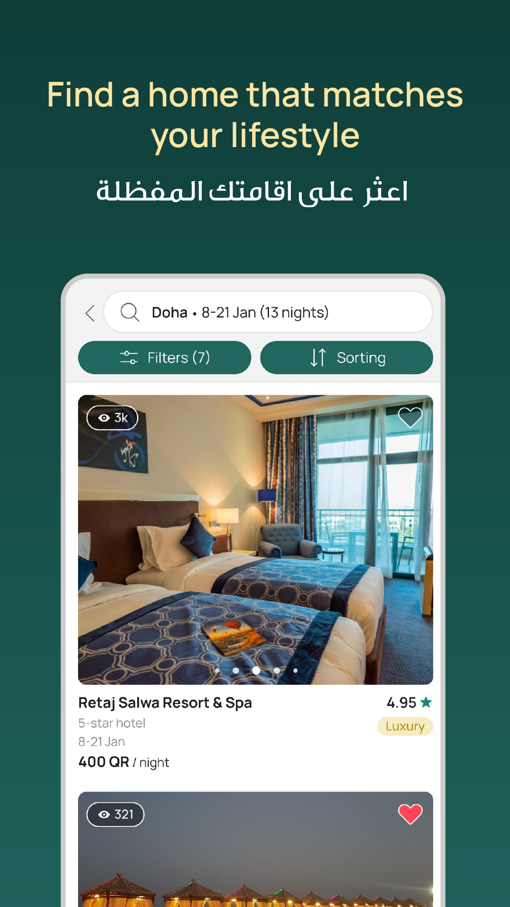 Booking with our app is easy and convenient. Whether you are looking for villas or chalets to rent in Qatar, or want to go camping, simply search for your desired location, dates, and activities, and we'll show you a selection of options to choose from. You can filter your results by price, rating, and amenities to find the perfect match. Once you've found what you're looking for, you can securely book and pay for your stay or experience through the app. Renting in Qatar is made easier with our app.