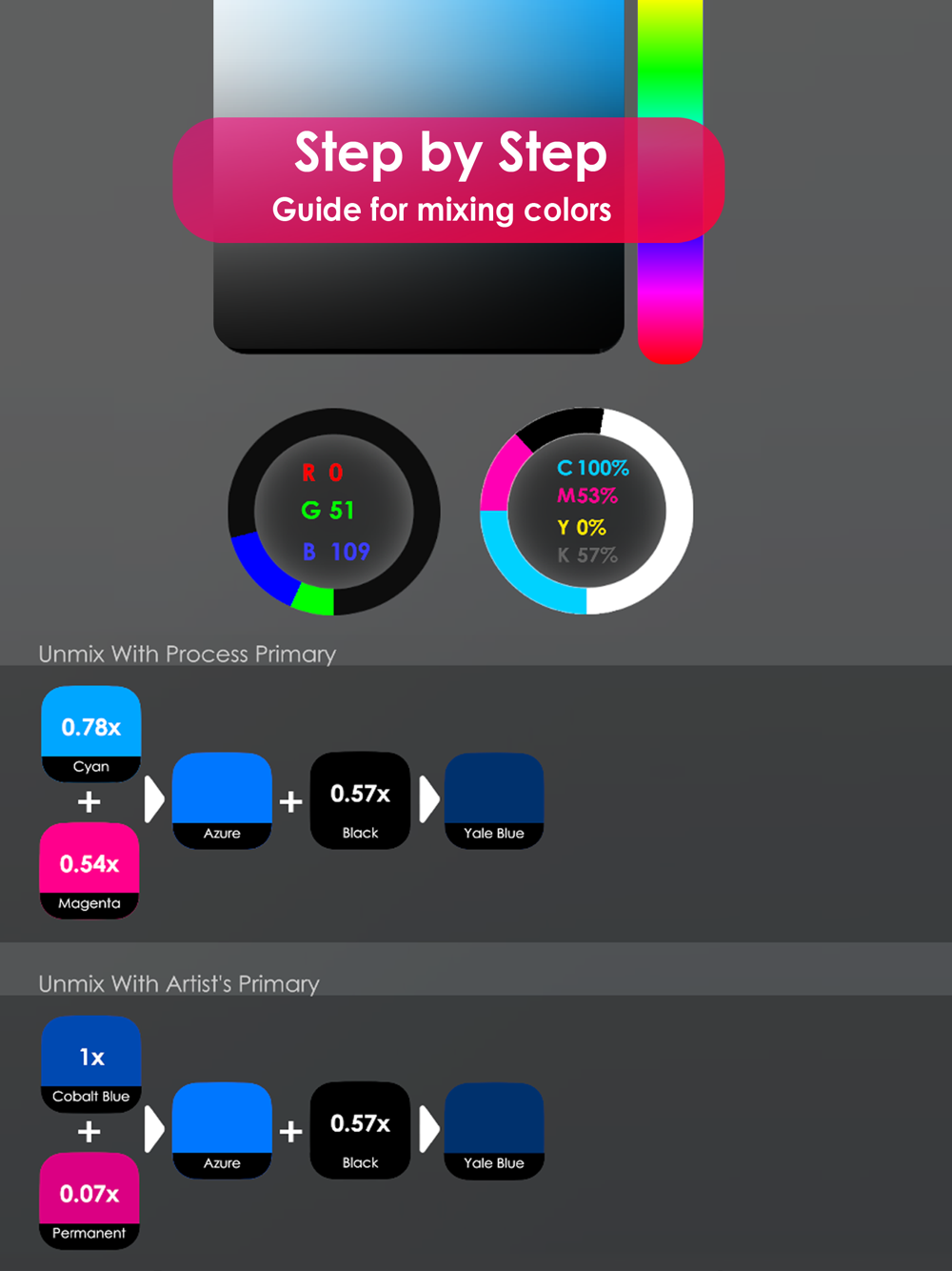 Mixer is a color mix simulator where you can mix commonly available watercolors and explore the results. Mixer will give you step by step instructions to recreate a color in real world using the colors in your watercolor palette.