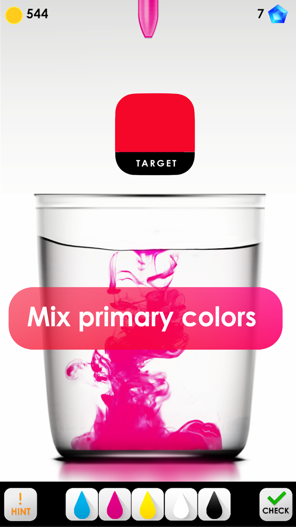 Get the target color by mixing Cyan, Magenta,Yellow, Black paints. There is no time limit and use white white paint to reduce saturation of colors you just mixed. Once you are happy with the result you may press the check button to see the match percentage.