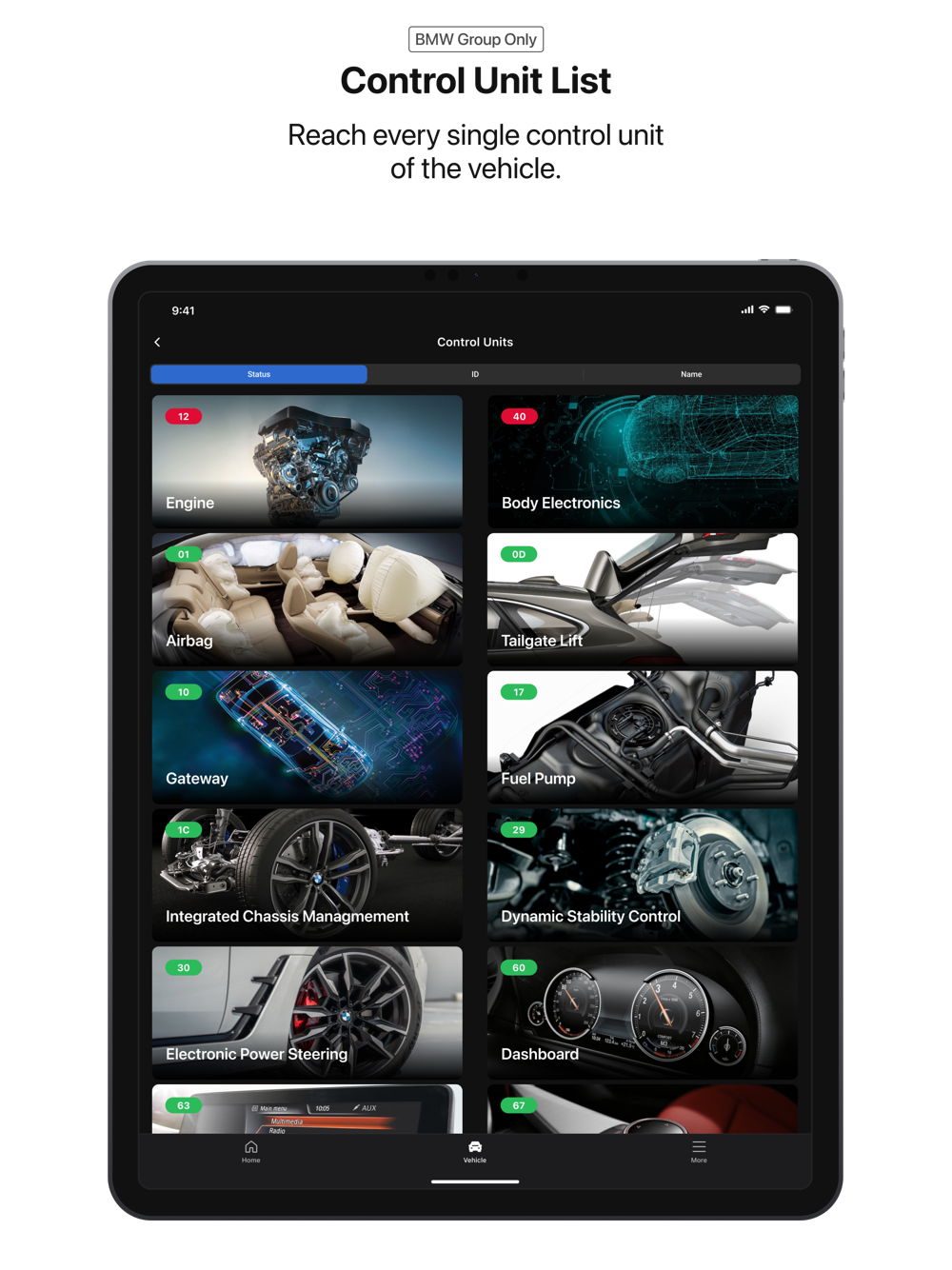 • Perform Advanced Diagnostics – scan all available control units, read, clear, and share trouble codes for E (from 2008), F, G, I-series, MINI (F-series), and select Rolls-Royce models.