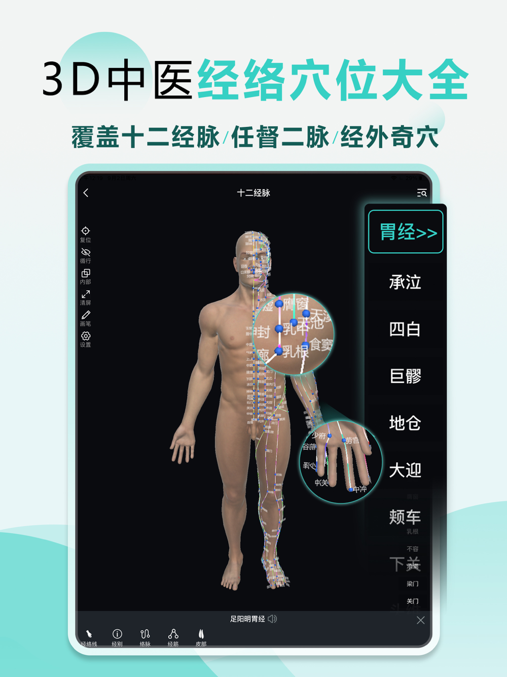 7.经络穴位:可在3D人体解剖模型上搜索定位穴位及经络循行,观看真人取穴视频,进针动画形象演示针灸操作过程。
