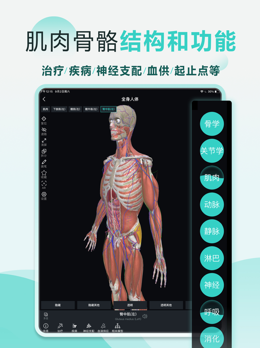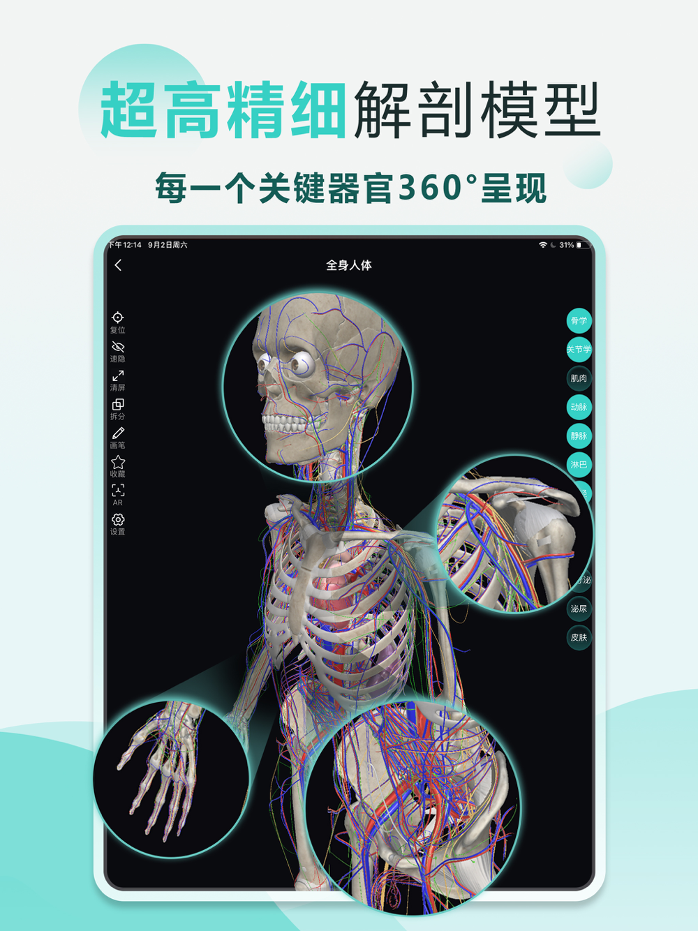 2.局部解剖:精细的解剖结构,从浅表层到最深层,提供各层肌肉的可视化,加深临床学习效果