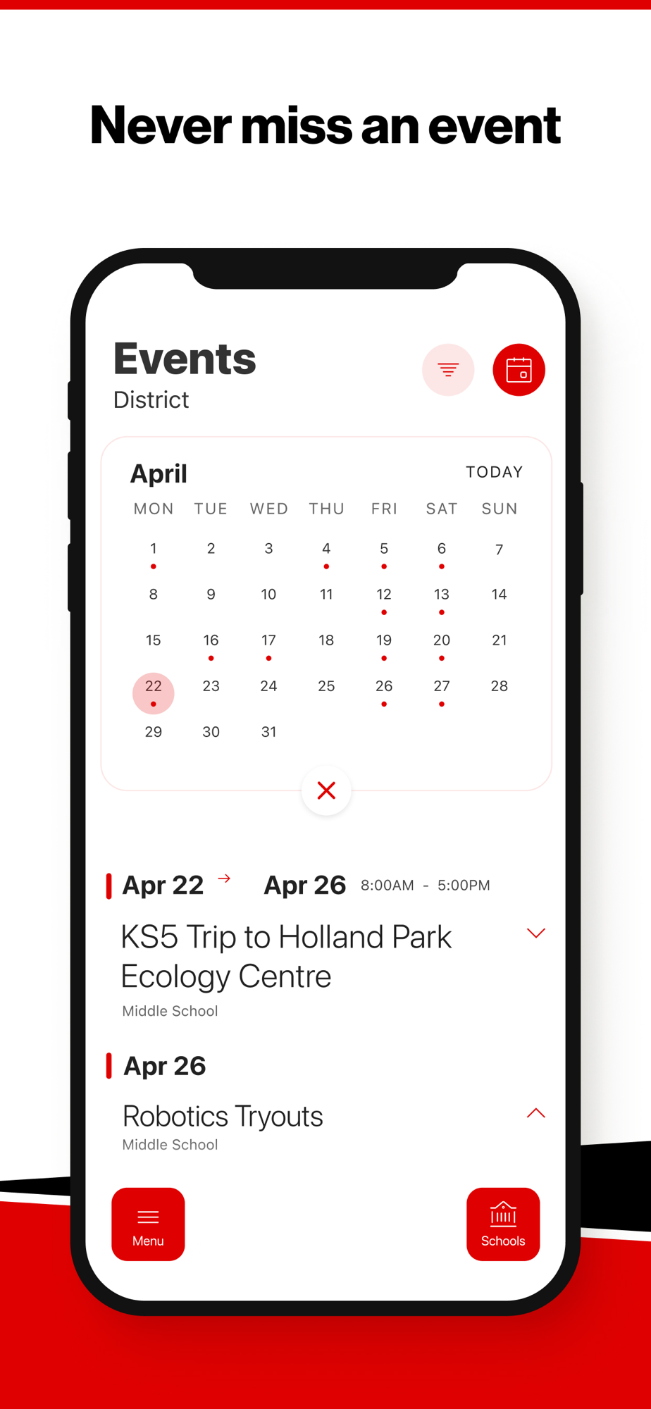 The event section shows a list of events throughout the district. Users can add an event to their calendar to share the event with friends and family with one tap.