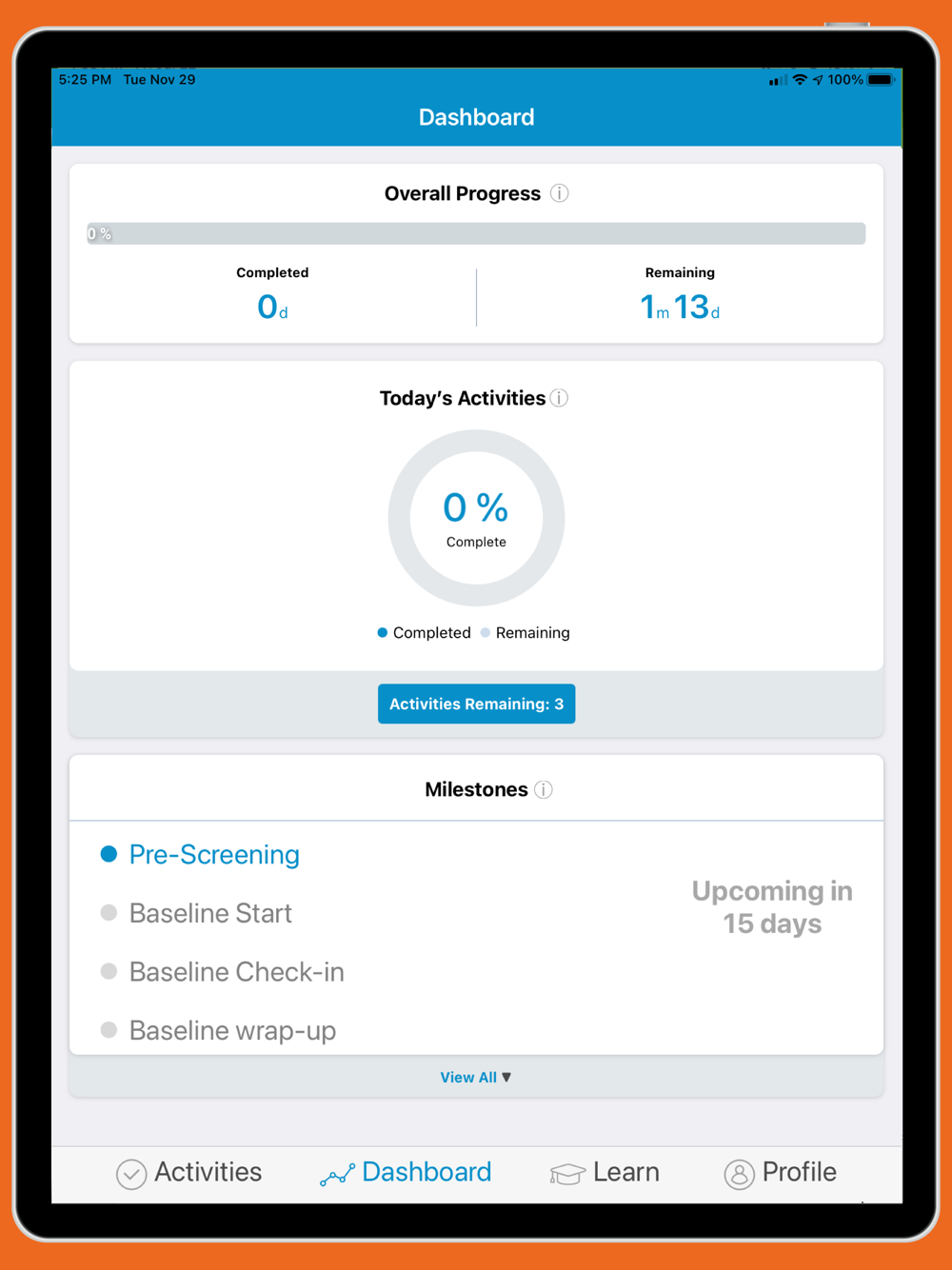 The app is used by participants to complete their study diary and other study activities and attend virtual telehealth visits with the research coordinators.