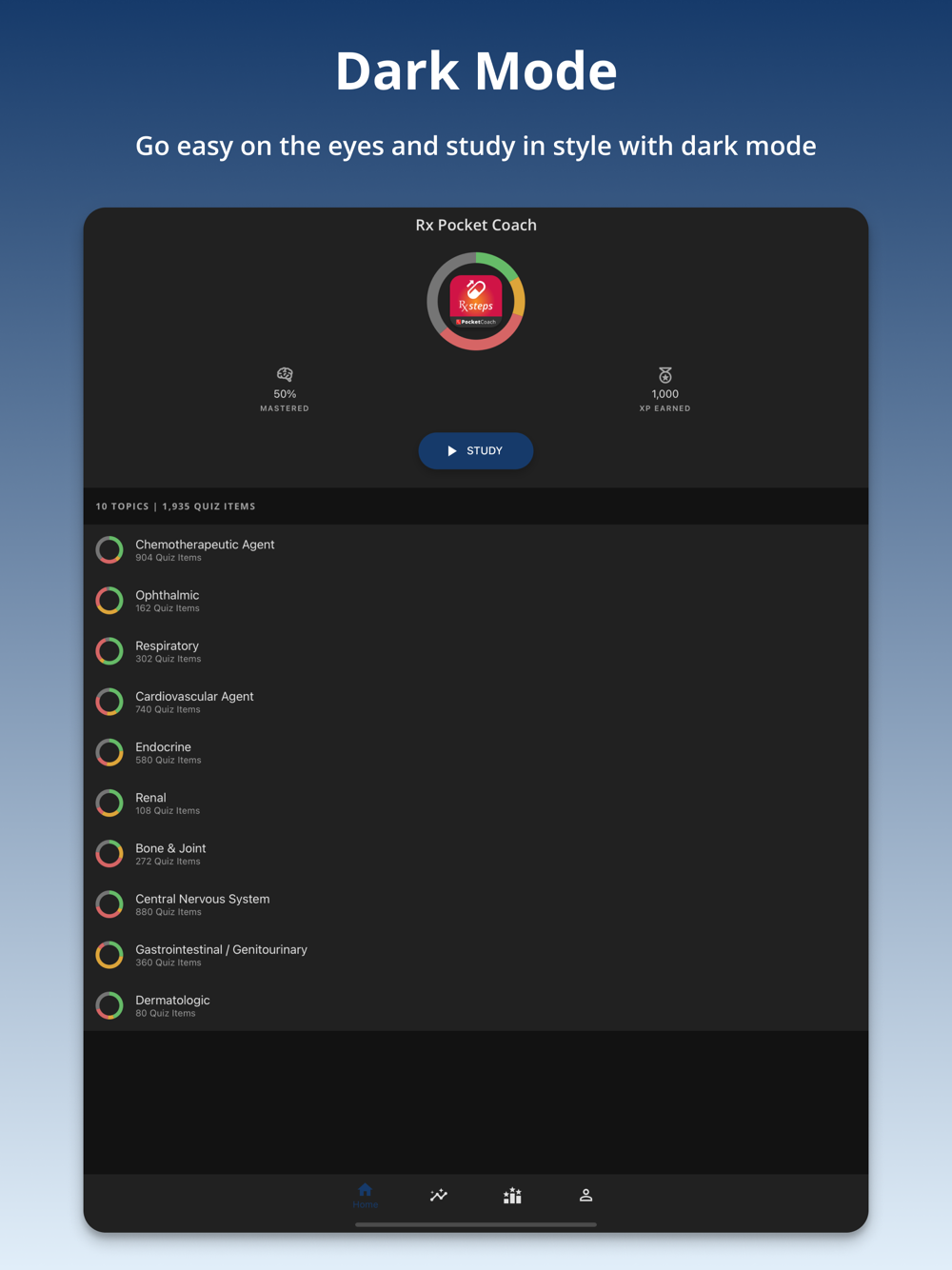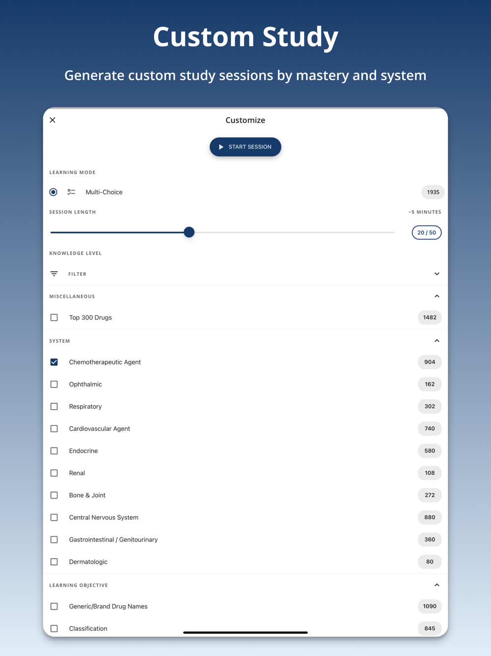 - Progress Tracking: Track your progress across every drug, system, and learning objective.