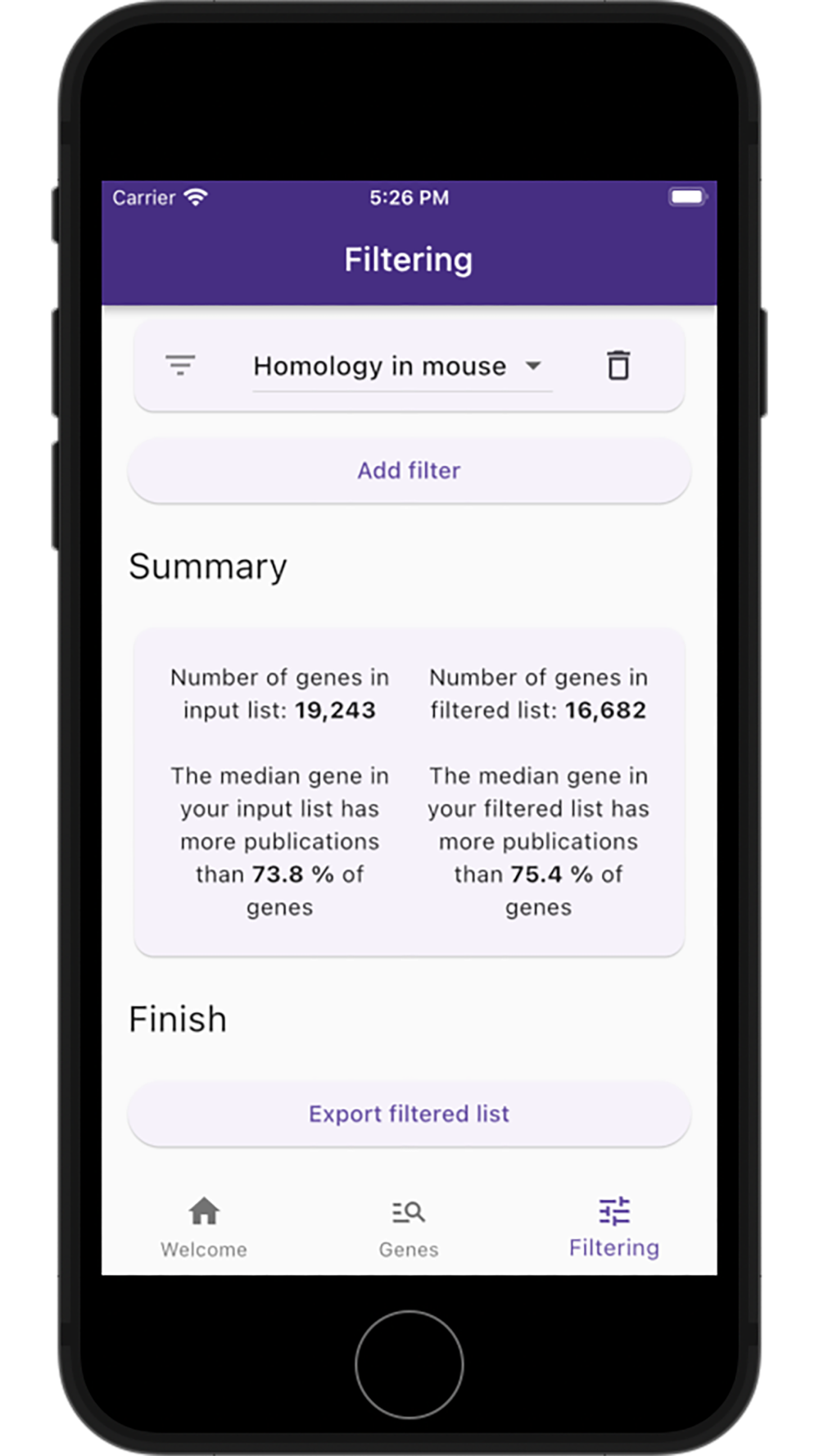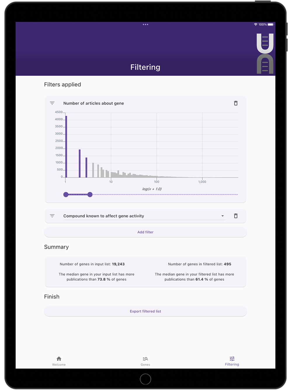 Users submit a list of human genes (presumably from a high-throughput -omics experiment) and can filter these genes down based on a large list of factors, including:
