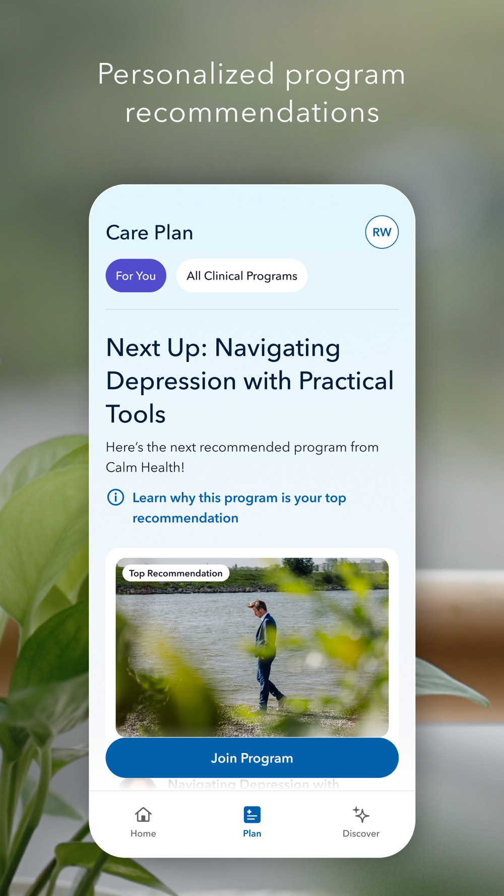 When you join Calm Health, you’ll receive a personalized Care Plan to guide you through the programs most relevant to your individual needs. You’ll learn to better understand and manage your health with recommended resources that are meaningful to you. Track your progress with short screenings that help you understand where you are in your journey and allow Calm Health to give you a more personalized experience.
