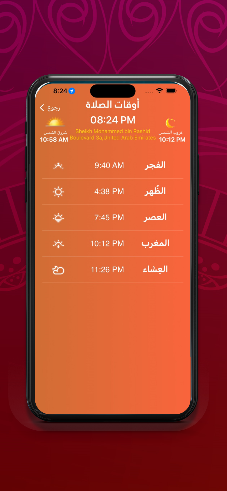 التطبيق يحتوي على تفاصيل أوقات الصلاة واتجاه القبله