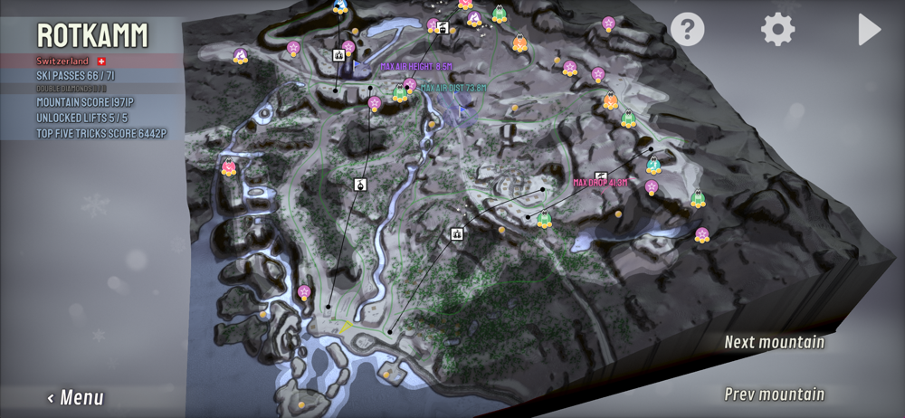 Completing challenges earns you Ski Passes, which unlock ski lifts that take you to new parts of the mountain.
