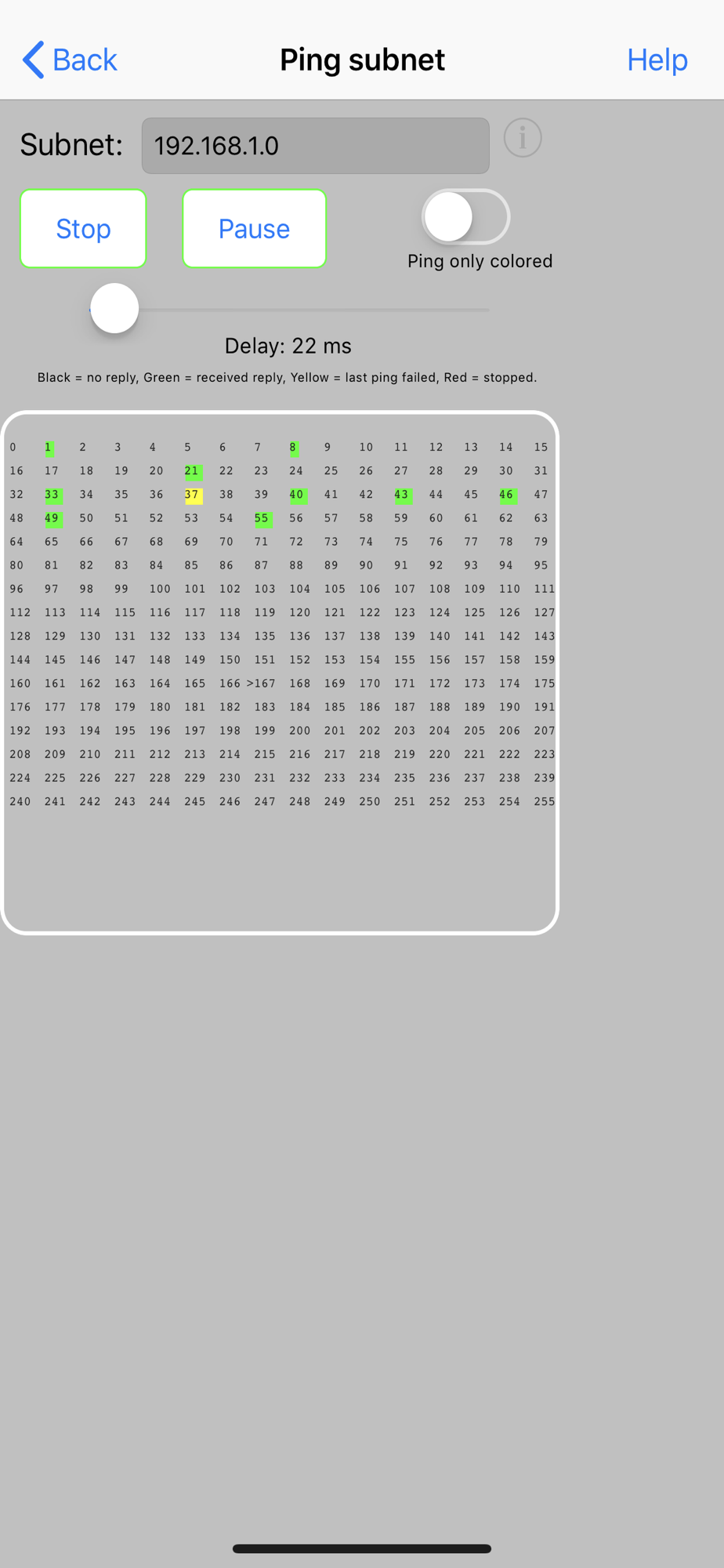 Network Ping is a software test tool for maintaining and debugging network problems on a local area network (LAN). Get an easy view for a full subnet on a single screen. Look at the screen to the left displaying the status for devices 192.168.2.0 - 192.168.2.255. Green and the device is working, yellow, there is a problem, and red, the device is not any longer on the LAN.