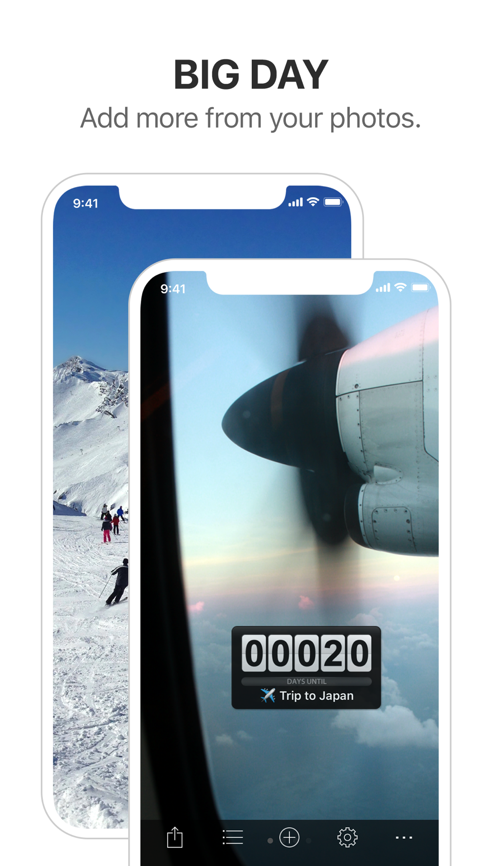 Big Day is a day tracking app and widget which tells you the remaining days until or starts counting the days after the event with your own photos. It is the simplest and the most beautiful way to track your big days.