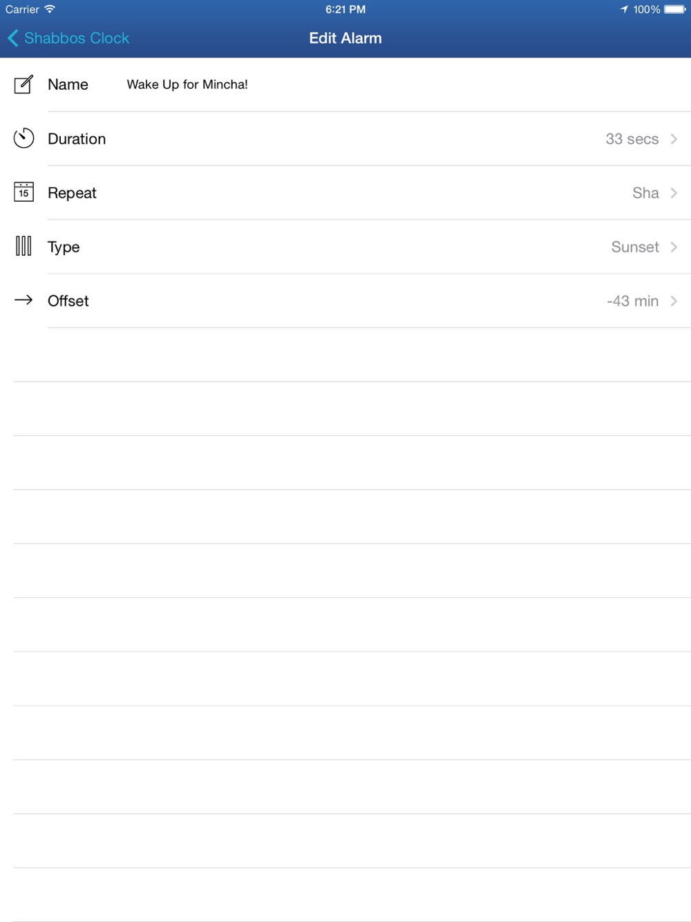 Important: For the alarm to be triggered, you must leave this application open. Closing the program or the iPhone will prevent the alarm from waking you up. Please also make sure your ringer volume is loud enough to wake you up. Make sure to plug in your device to prevent battery drain from not waking you up. Test BEFORE Shabbos to confirm your setup works.