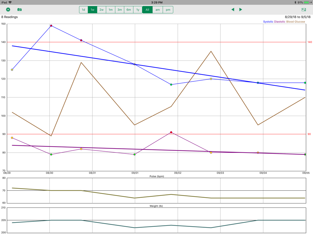 iBP uses color icons to indicate when your blood pressure values are normal, high, or hypertension. It also provides interactive graphs that allow you to display your values by weeks, months, year and time of day. The graphs display lows, highs, averages, and trend lines using statistical analysis.