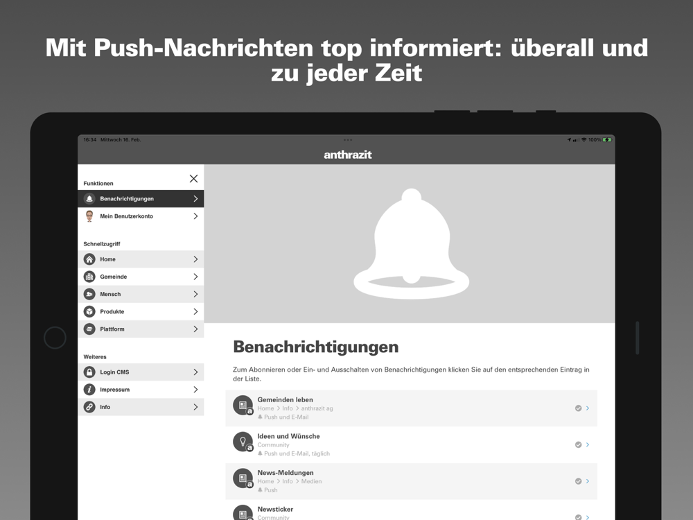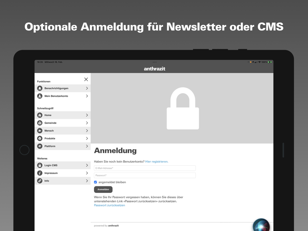 Mit der anthrazit-App können Sie eine auf mopage.ch erstellte App mit Ihrem iPhone oder iPad bearbeiten und als Preview ansehen. Zudem können News und der Blog mit Informationen aus unserer Redaktion via Push abonniert werden.