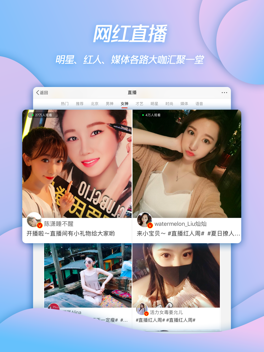 Discover: Check the hottest weibo and the most splendid content in the channels of Shopping, Movie, Music, Sports, Voyage, etc. You’ll find a whole new world here.