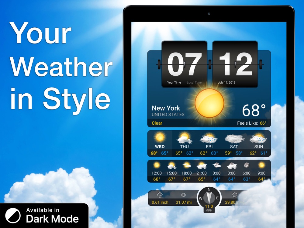 The Dark mode allows you to tone down the colors of your screen and let you experience the Weather in a dark environment. The dark mode protects your eyes from bright colors, saves battery power and helps you better focusing.