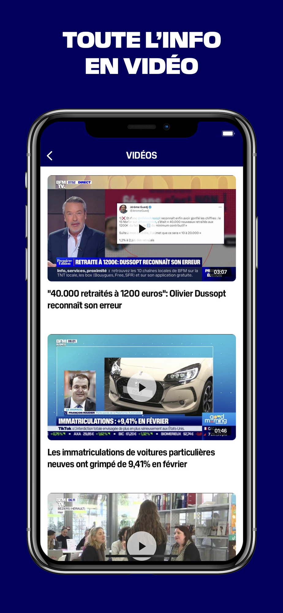 • Les replays des programmes BFM Business qui sont accessibles dans une rubrique dédiée et il vous suffit de faire défiler la sélection des vidéos en swipant.