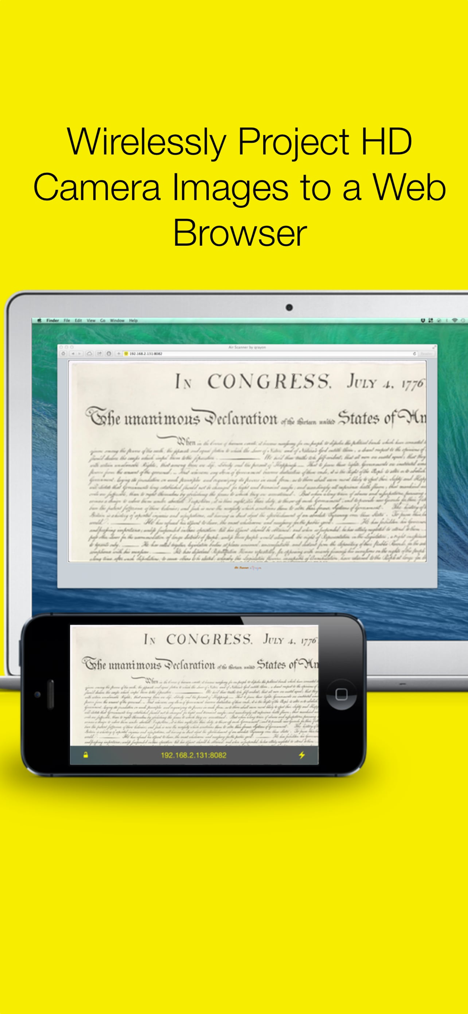 Air Scanner continuously takes photos with your device's camera and projects them to a web browser running on the same WiFi network, at 720P HD (1080P on iPhone 5 and newer generation devices) - allowing full page text and color photographs to come out crisp and clear.