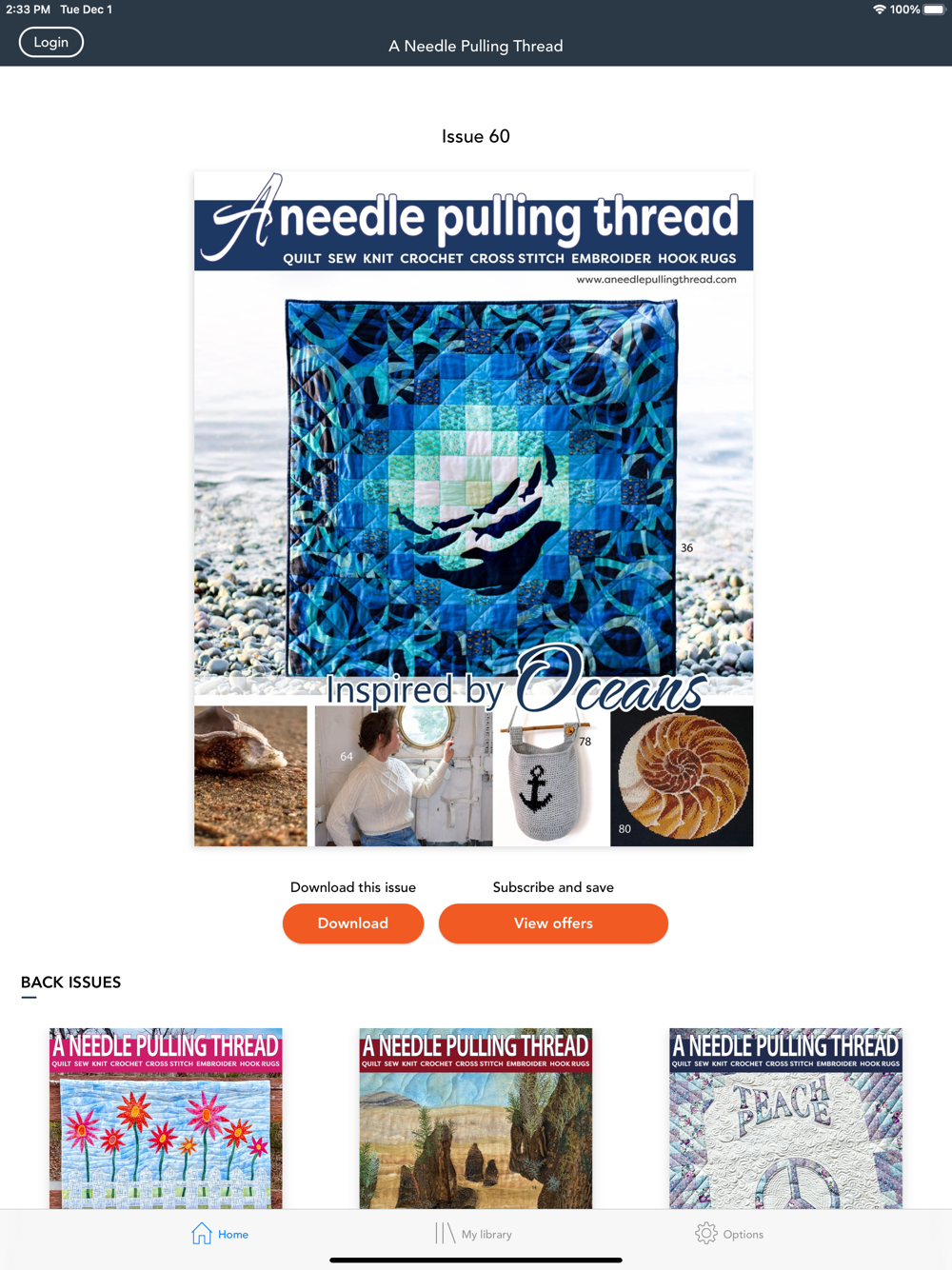 A Needle Pulling Thread® is a quarterly magazine that encompasses a wide variety of needlework in every issue: quilting, knitting, cross stitch, embroidery, crochet, beading, rug hooking, fibre art, sewing, and more. It includes projects with full instructions and stunning photography, as well as informative articles on trends and techniques, and needlework show reviews. Each issue is 100 pages or more in full colour.