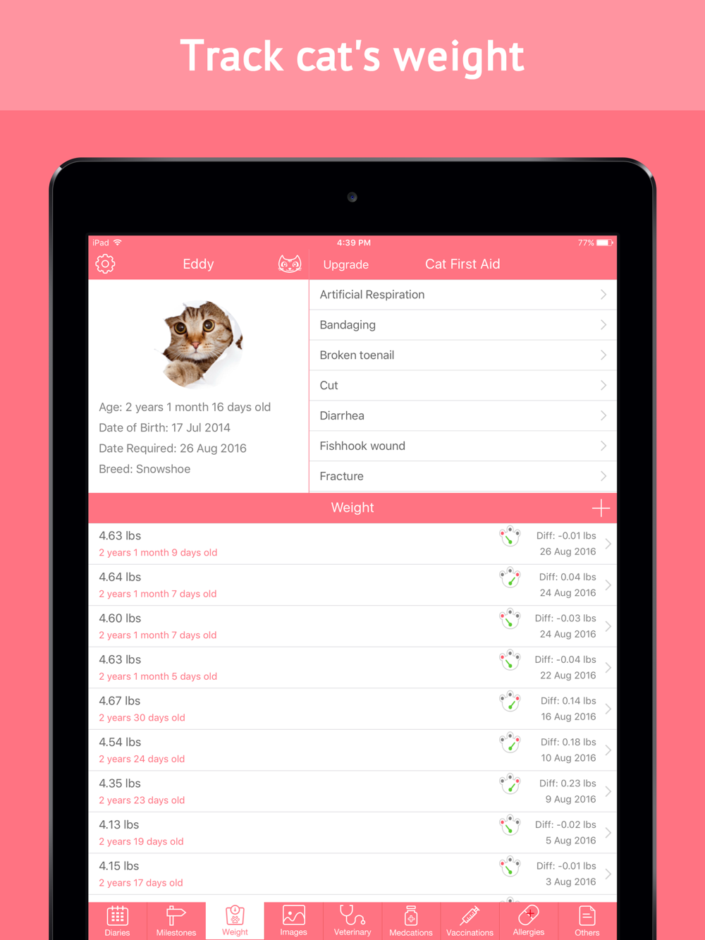 You can write your cats’ diaries, record the milestones of your cats and add the picture as souvenir, track your cats’ weight, save your cat s’ pictures, and track your cats veterinary, medications, vaccinations, allergies and other information relevant with your cats. With this App you can share your cats with your family and friends.