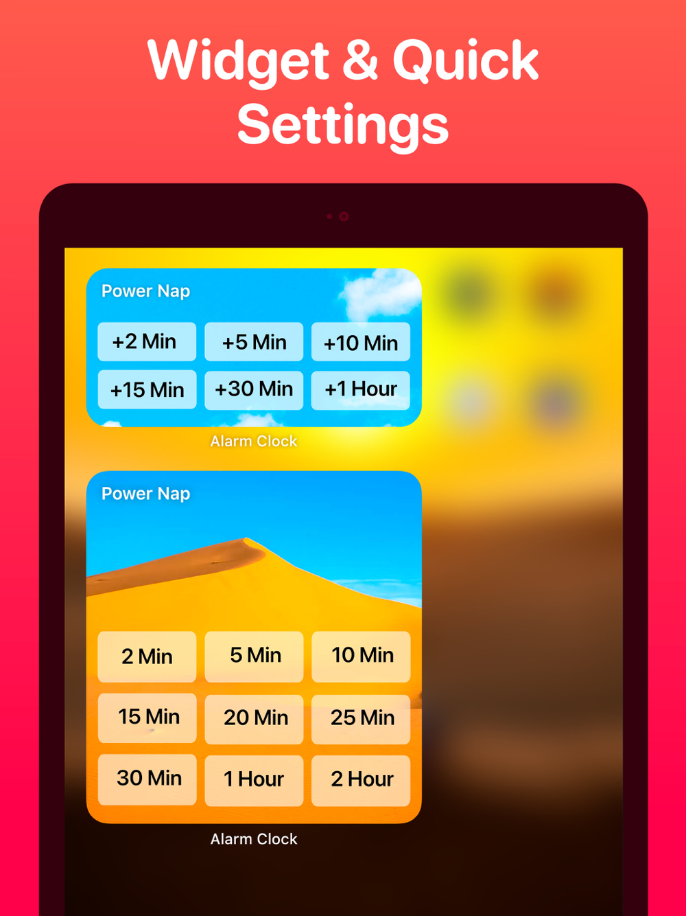 • Quick alarm to set a time limit for power naps and other short tasks.