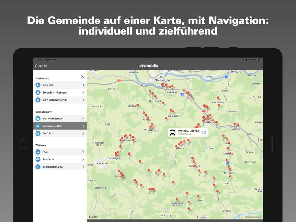 Laden Sie jetzt die citymobile-App herunter und verschaffen Sie sich einen Überblick über Ihre Gemeinden. Sie erhalten Informationen über alle rund 2200 Gemeinden. Je nach Modulen, welche die Gemeinde aktiviert hat, erhalten Sie aktuelle Events, Informationen zu Restaurants, Wandertouren und interessante Standorte zum Entdecken und Erleben. Auch ÖV-Haltestellen mit Abfahrtsplan und direkter Buchung von Tickets bekommen Sie direkt auf das Smartphone.