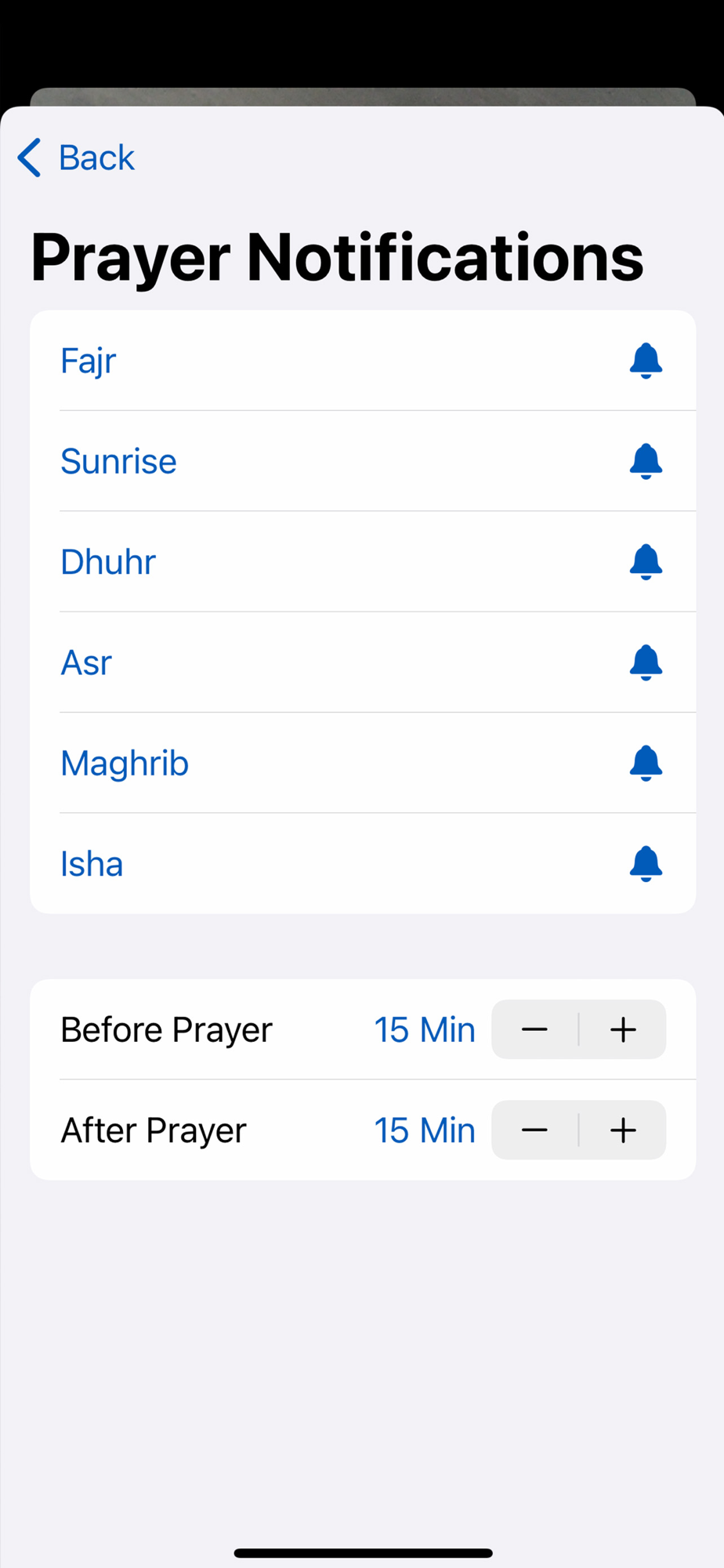 •عرض اوقات الصلاة، وتنبيهات في وقت الصلاة، وقبلها وعند الإقامة