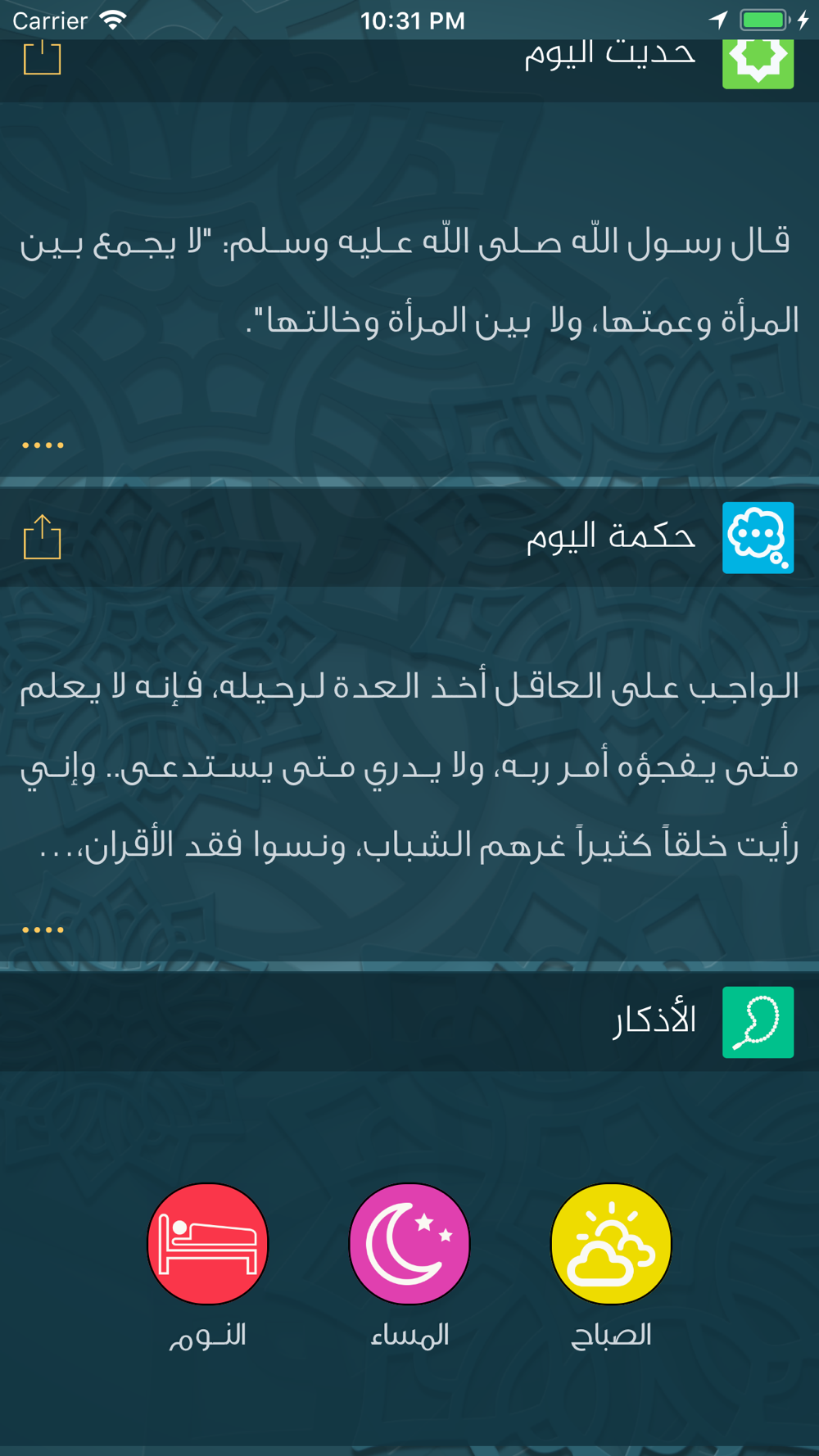 تم ايضا اضافة حديث اليوم حيث تم اختيار مئات الاحاديث التي تحفزك للقراء والتمعن بالسنة النبوية كلما فتحت التطبيق