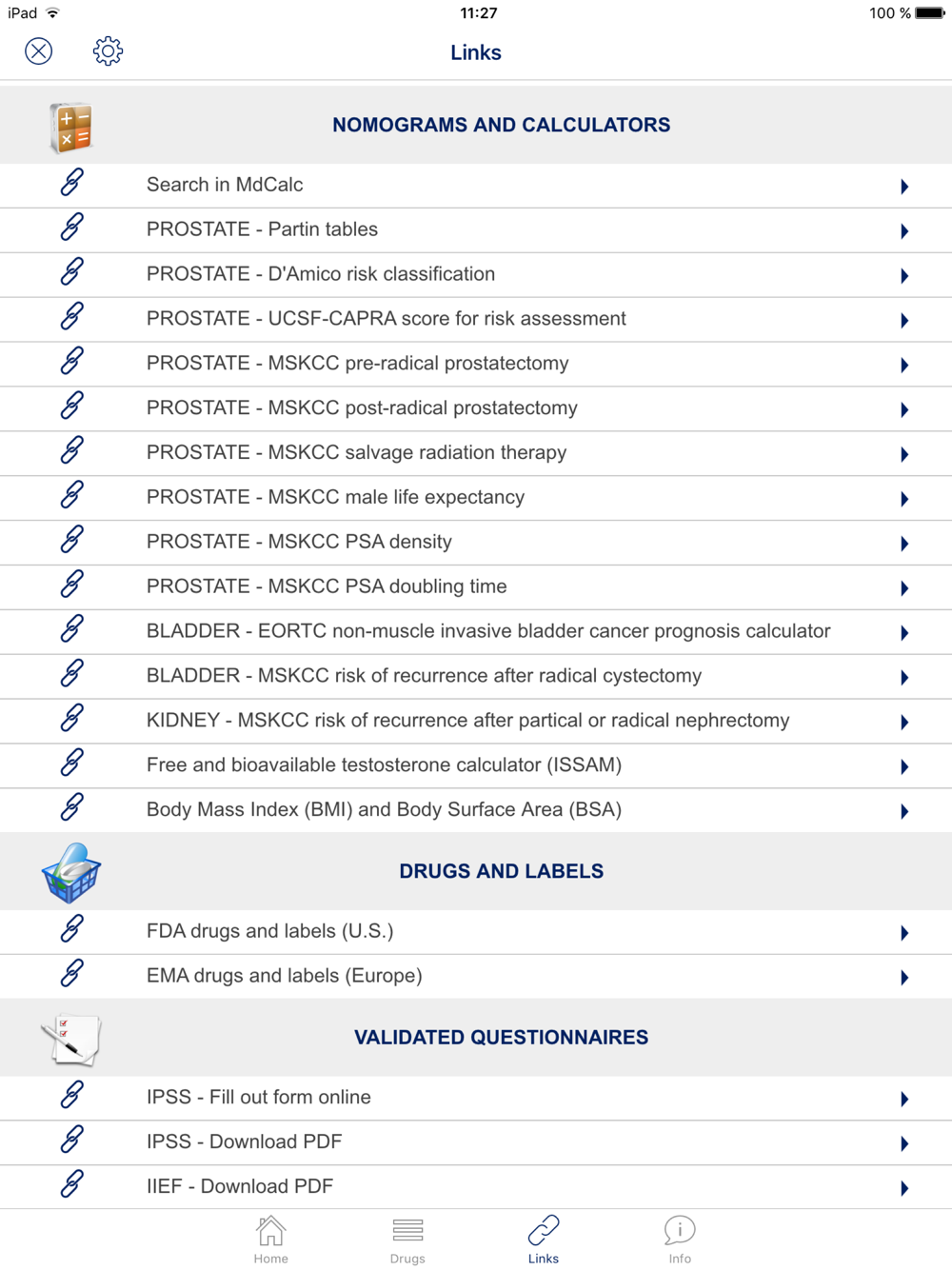 - Urology links: in-app browser access to several websites (e.g. calendars of urologic events, journals, validated questionnaires, prostate, bladder and kidney nomograms, free testosterone calculator and more).