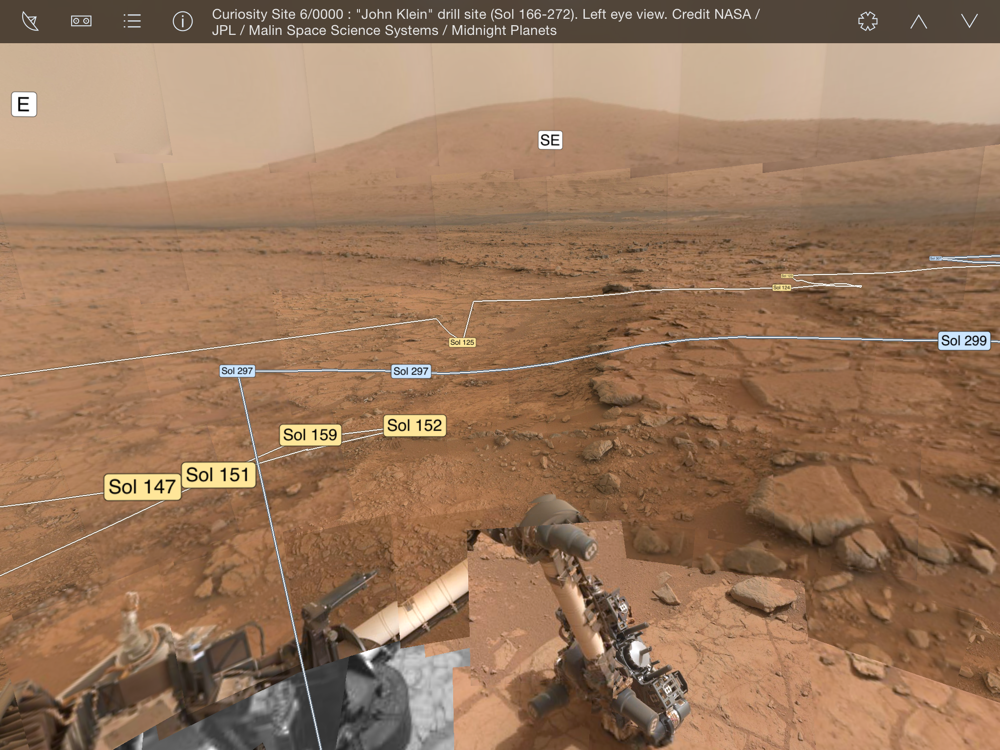 Midnight Planets lets you explore Mars as seen by the Mars Rovers Curiosity, Spirit and Opportunity. It lets you view almost every image returned by the rovers in panoramic context, and provides a number of options for viewing in 3D. The app is an ongoing project in visualizing other worlds, using image data from spacecraft exploring our solar system.