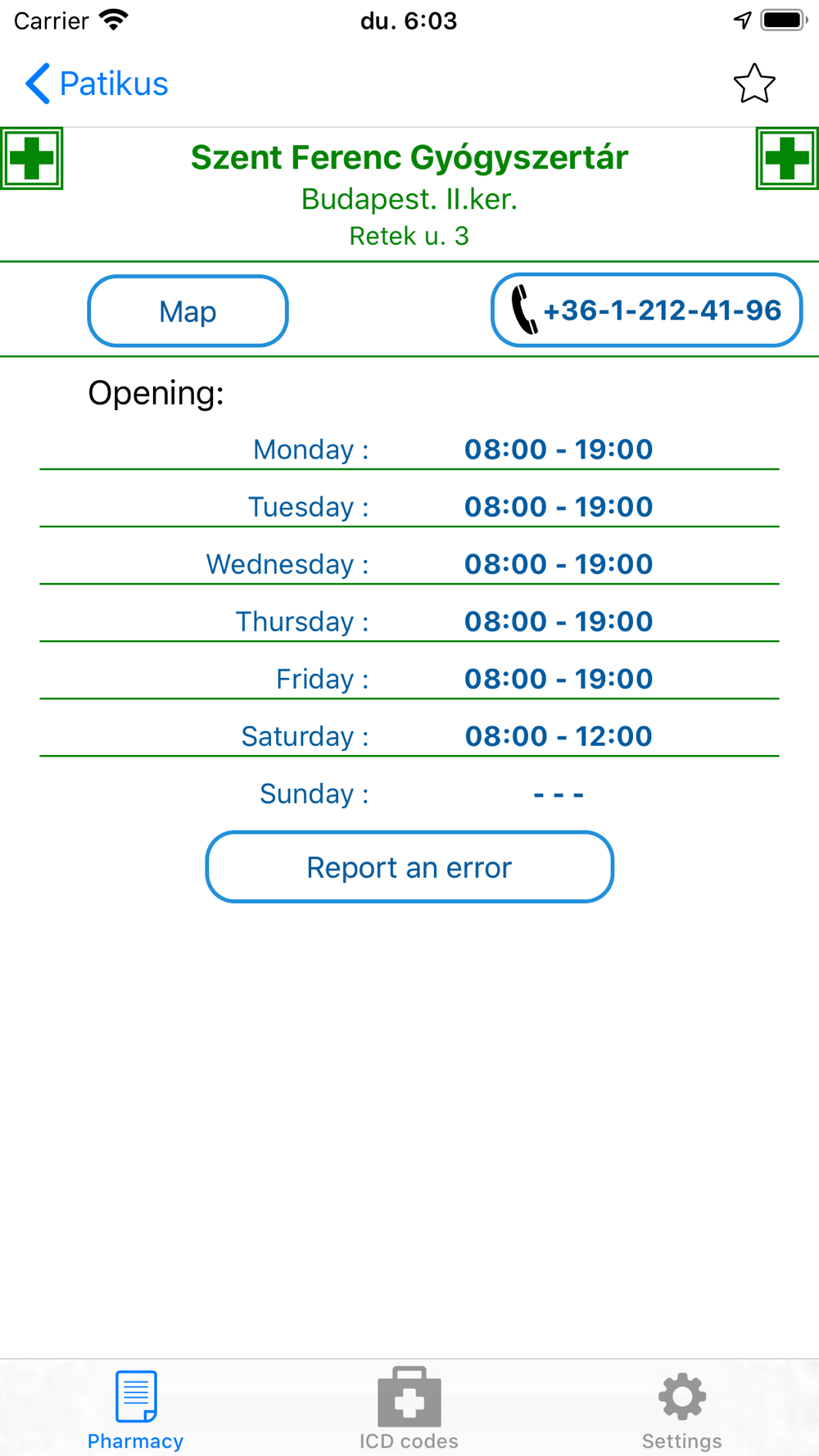 Ez az alkalmazás a Budapesten gyógyszertárat, patikát keresőknek készült. Az alkalmazás az aktuális helyzethez képest kiszámolja, hogy milyen messze találhatóak az ismert gyógyszertárak, ezt listában és térképen is megmutatja.