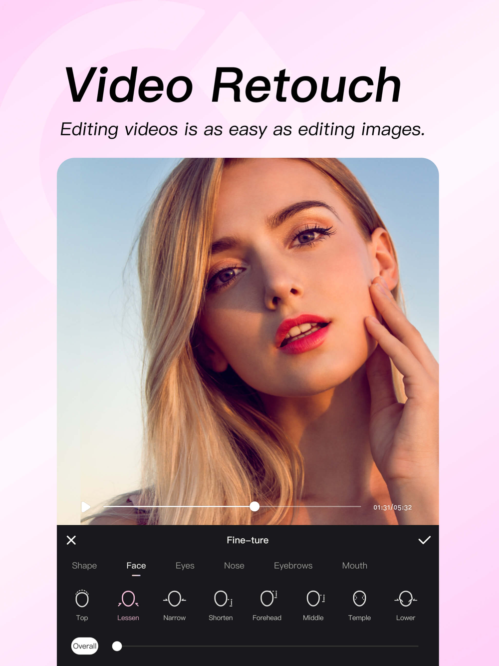 With features such as one-tap auto-retouching, skin/hair correction, slimming, leg-lengthening, spot removal, and more, you can look as good as you feel.