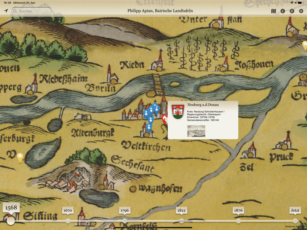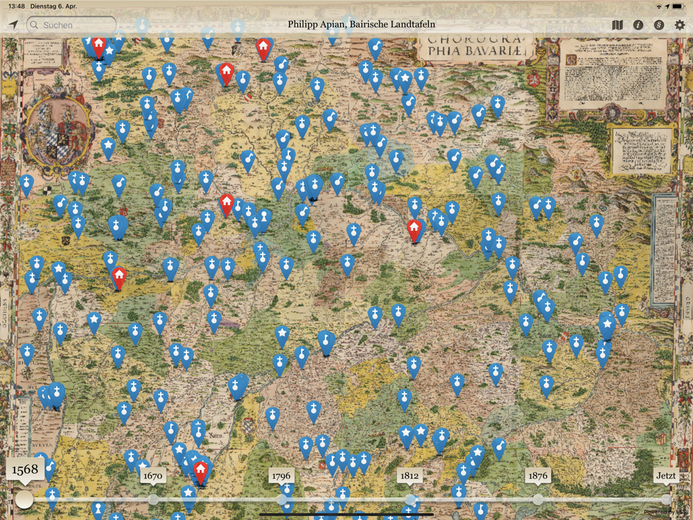 Die Location-Based-Services-App „Bayern in historischen Karten“ nimmt Sie mit auf eine faszinierende Entdeckungsreise zu Bayerns Städten, Orten und Kunstdenkmälern. Einzigartige und seltene historische Karten Bayerns aus dem Besitz der Bayerischen Staatsbibliothek, von den Landtafeln Apians (1568) bis zum „Topographischen Atlas vom Königreiche Baiern“ (1812-1867), können in allen Details betrachtet und interaktiv erkundet werden. Ihre aktuelle Position als Betrachter wird direkt in der historischen Karte angezeigt, über eine Zeitleiste können Sie bruchlos zwischen den verschiedenen Kartenwerken navigieren. Vielfältige Points-of-Interest bieten Ihnen vertiefende Darstellungen zu Orten, Burgen, Klöstern und Schlössern in der Umgebung Ihres Standorts, unter anderem 1.000 historische Ortsansichten von Wening, Merian und Schedel. Als besonderes Highlight bietet Ihnen der Nürnberg-Schwerpunkt vielfältige multimediale Informationen rund um die Kaiserburg-Stadt.