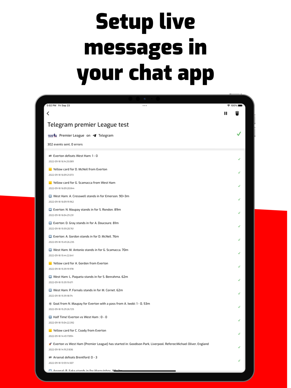 Follow the action closely with real-time push notifications for every event during a game. Experience the exclusive feature of receiving live game events in your favorite messaging app. Try it out and enhance your football live action!