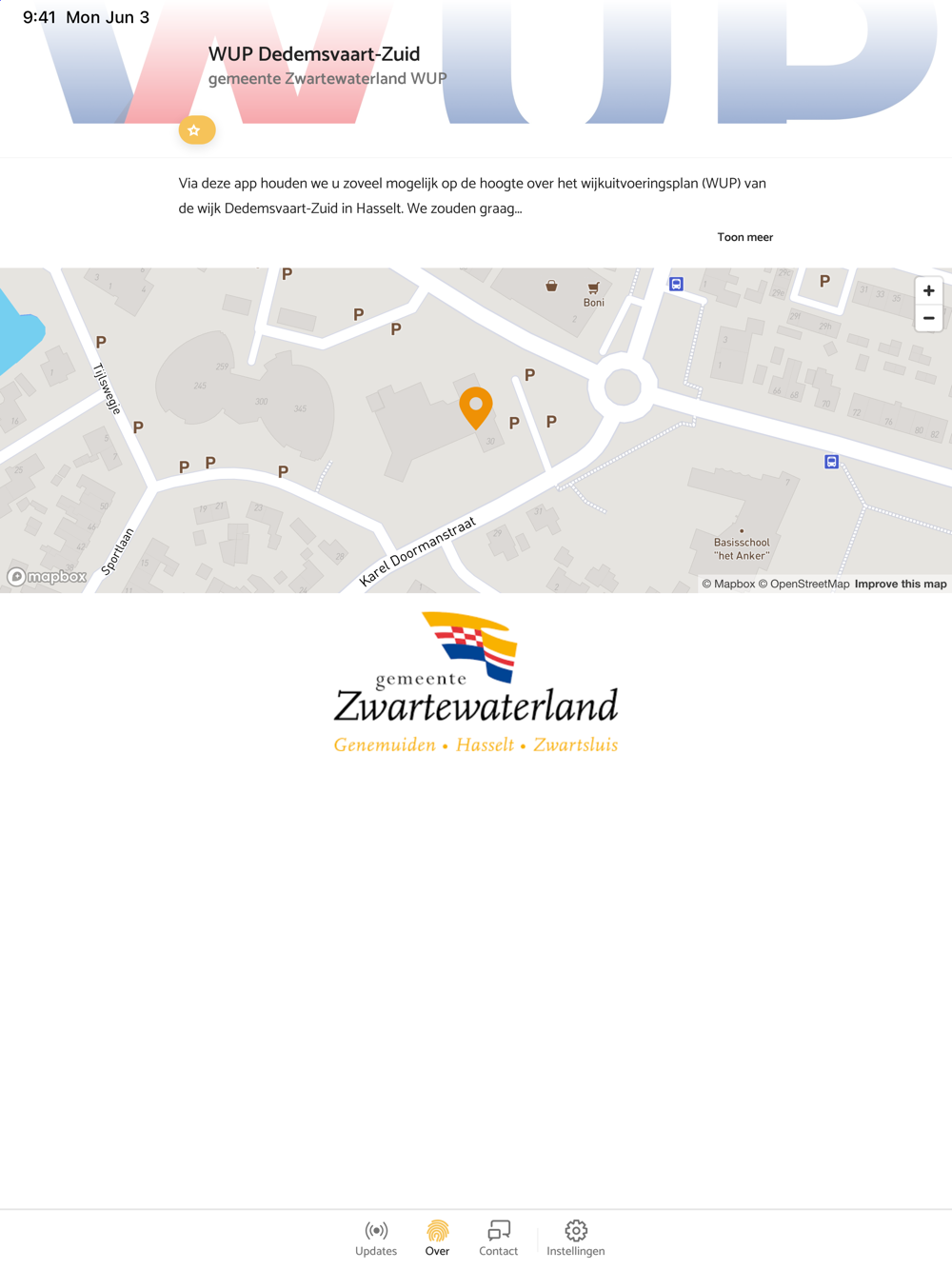 Via deze app wordt u op de hoogte gehouden van de wijkuitvoeringsplannen (WUP) in de gemeente Zwartewaterland. De WUP stellen we samen met de buurtbewoners op en er komt in te staan wanneer en op welke manier de wijk van het aardgas gaat. Dat doen we voor vijf wijken, Achter ’t Tag, Barsbeek, Dedemsvaart-Zuid, Greente en Hasselt om de Weede.
