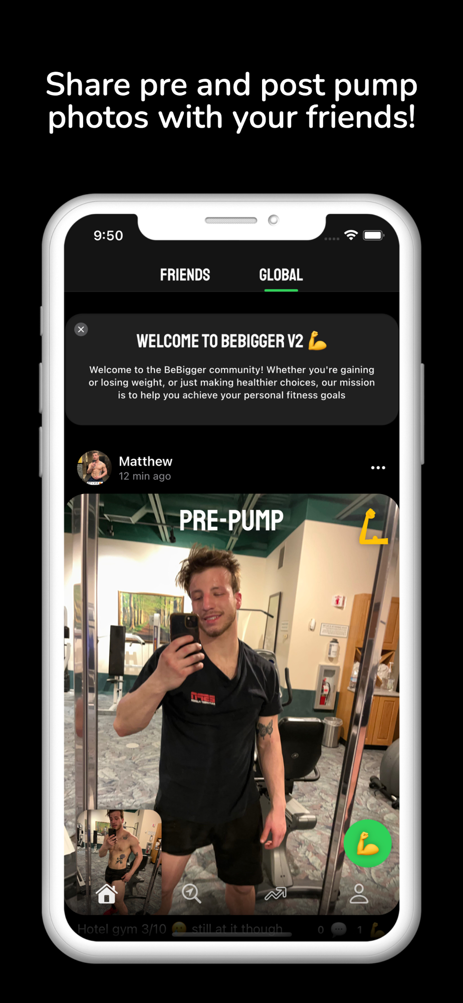 BeBigger is the easiest way to track your physique progress and share your gainz with your friends! Once a day, take a pre and post-pump photo and share it with your friends. All of your workouts are saved in the progress feature where you can see your physique progression over time!