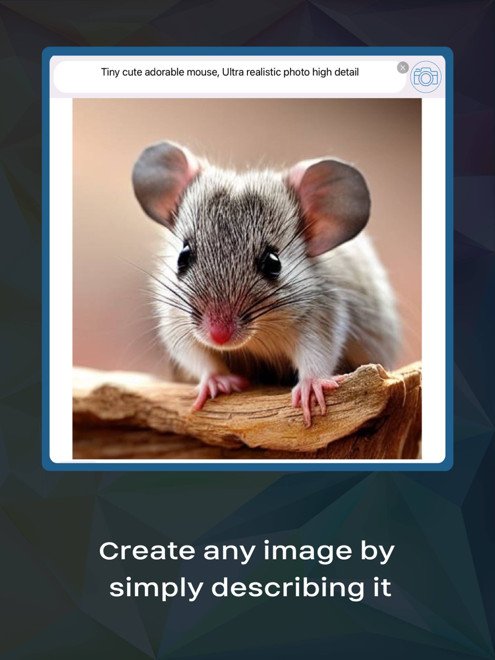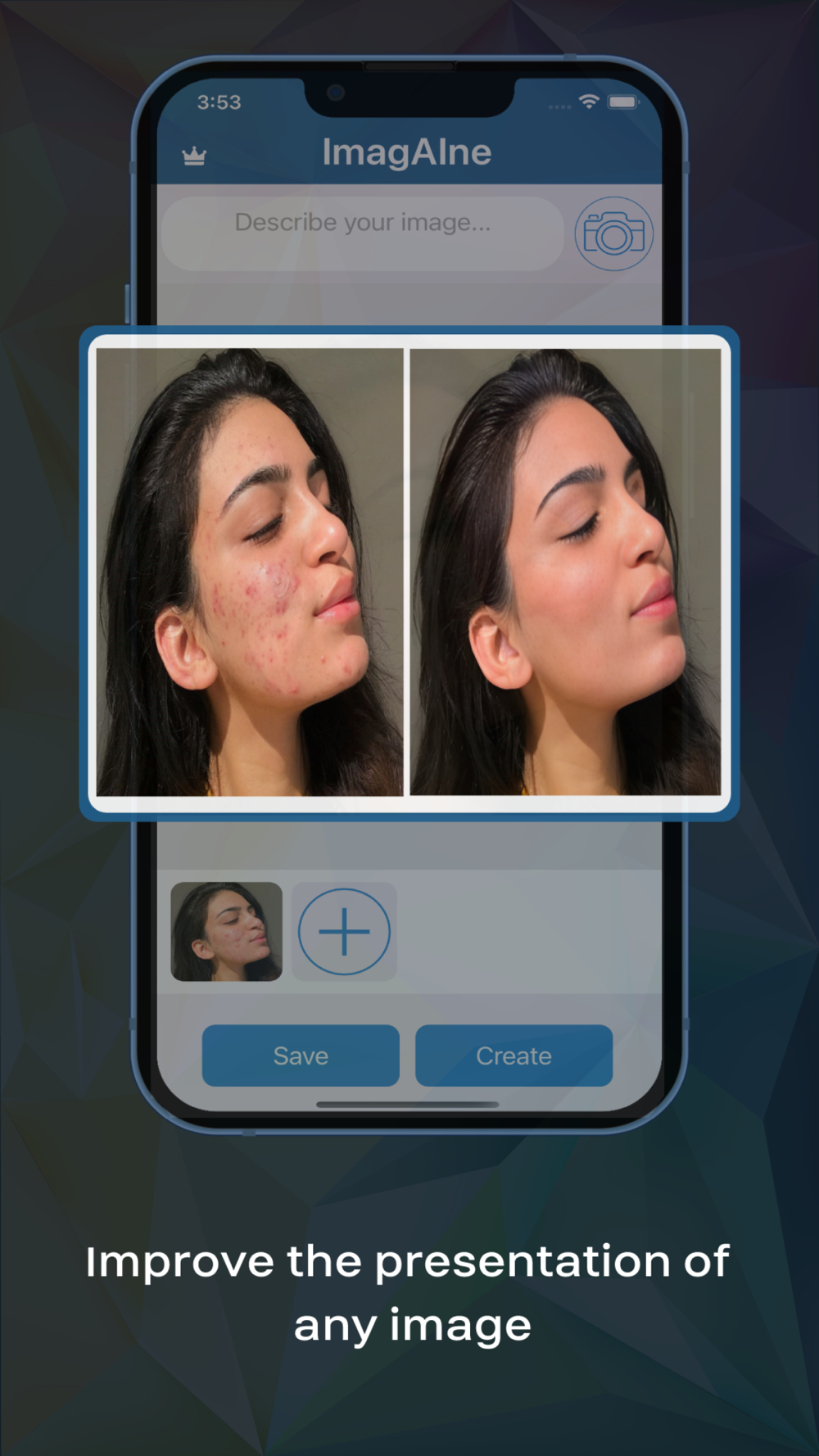 With ImagAIne you can generate any image with just a few words. Describe the image, press ‘create’ and the app will present an image that reflects what you have written. The sky is the limit, there are no restrictions.