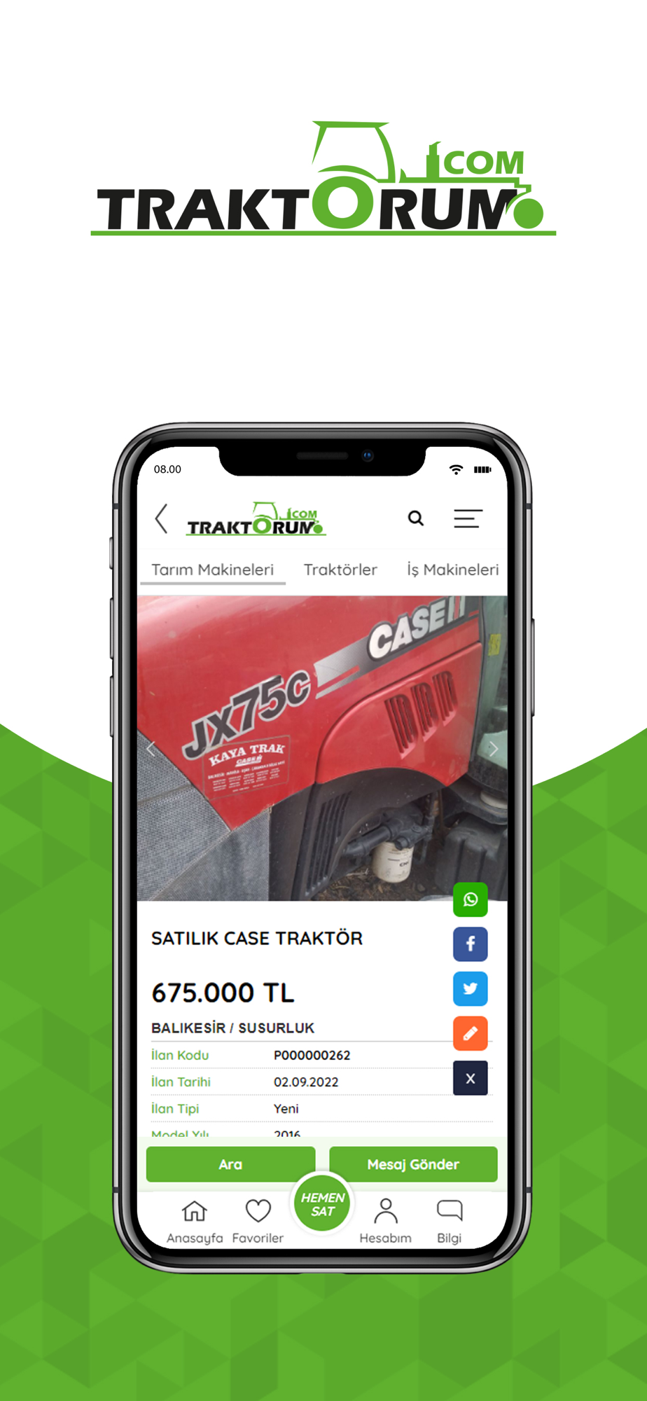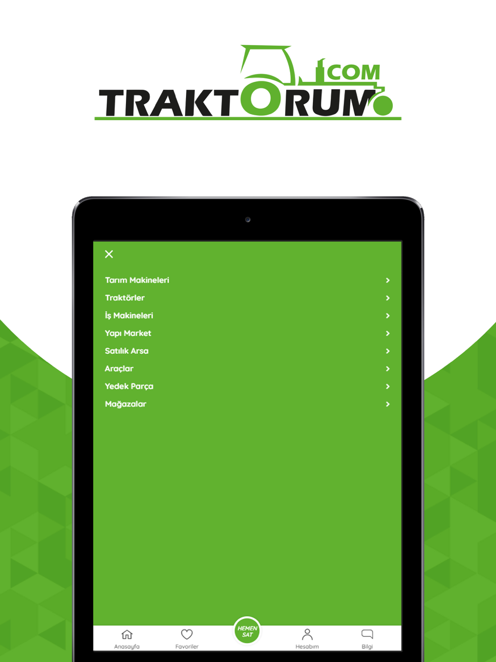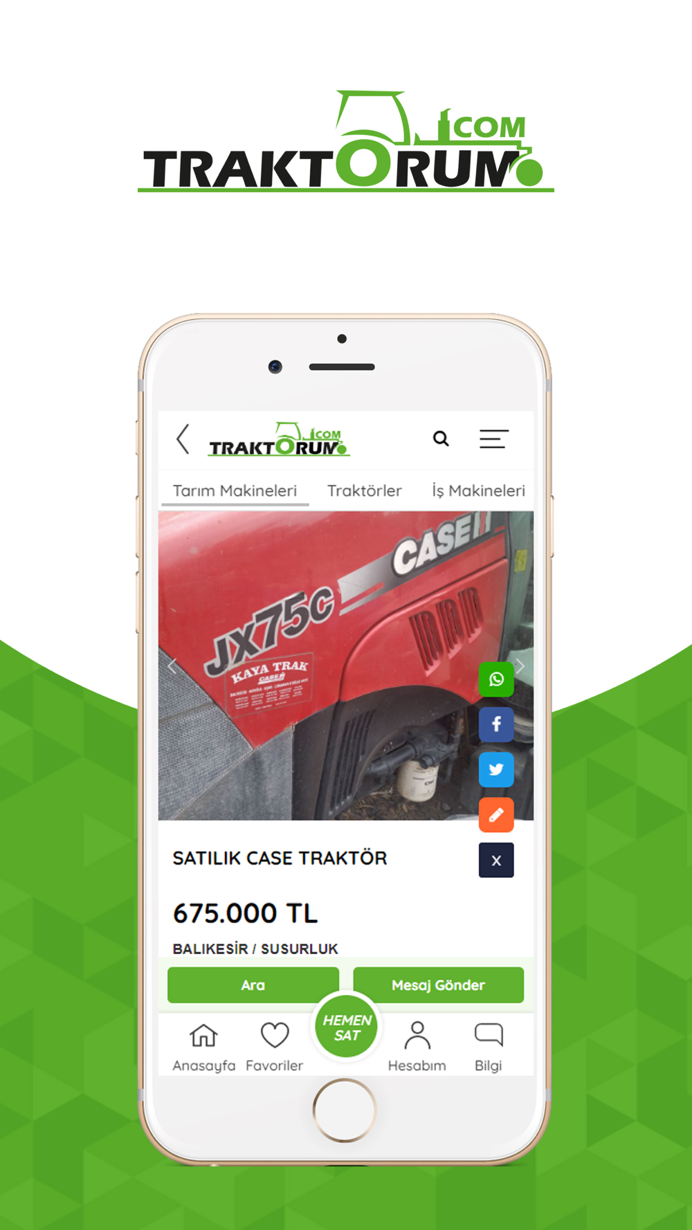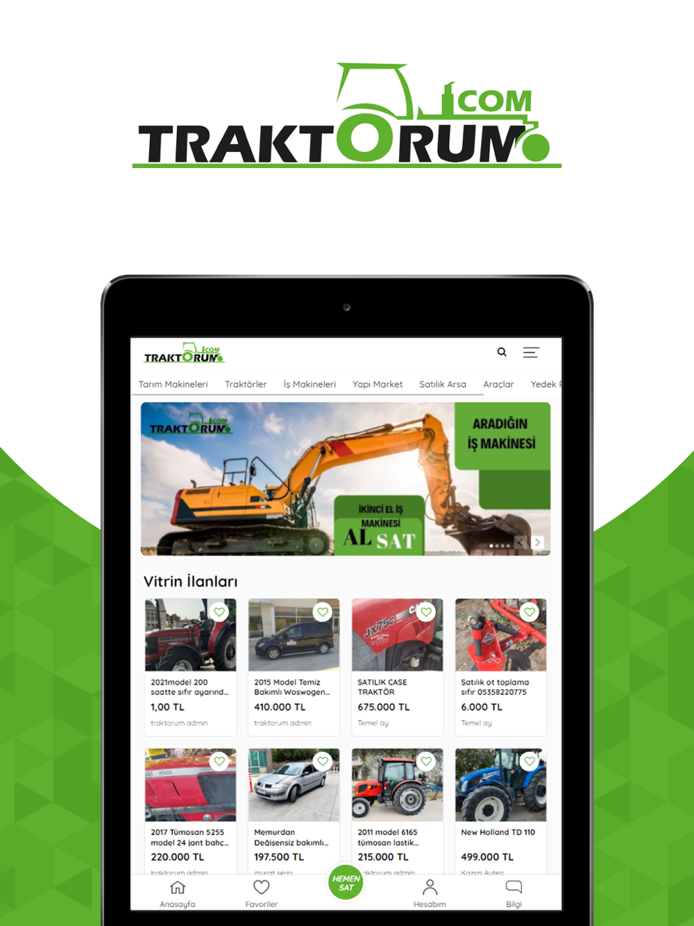 Türkiye'nin ilk ve tek traktör ilan sitesi olan traktörüm.com tarımsal üretim ile yazılım teknolojisini birleştirerek çiftçilerimizin ihtiyaç duyduğu tarımsal alet-edevat, makine ve teknolojiye daha kolay ulaşmalarını amaçlayan bir ''e-ticaret pazar yeri platformu'' dur. traktörüm.com çiftçilerimizin artık kullanmadığı ve satmak istediği tarım aletlerini yeni alıcılarıyla buluşturur. Bu şekilde tarımsal üretimin bel kemiğini oluşturan ''tarımda makineleşme ve teknoloji kullanımına'' katkı sağlarken çiftçimizin girdi maliyetlerinin büyük bir bölümünü oluşturmakta olan bu makinelerin birbirleri arasında tekrar kullanımını ve değerlendirilmesini sağlar. Başta ikinci el tarım aletleri olmak üzere çiftçimizin ihtiyaç duyduğu araç-gereçlerin daha ulaşılabilir olmasını sağlayan traktörüm.com verdiği bu hizmetle ülkemizin tarımsal üretimine dolaylı yoldan katkıda bulunmaktadır. ''çiftçinin aradığı ne varsa traktörüm.com'da'' sloganıyla kısa zamanda büyük bir kitleye ulaşan traktörüm.com'da çiftçilerimiz ücretsiz bir şekilde üyeliklerini oluşturup ilk ilanlarını yayınlayabilirler.