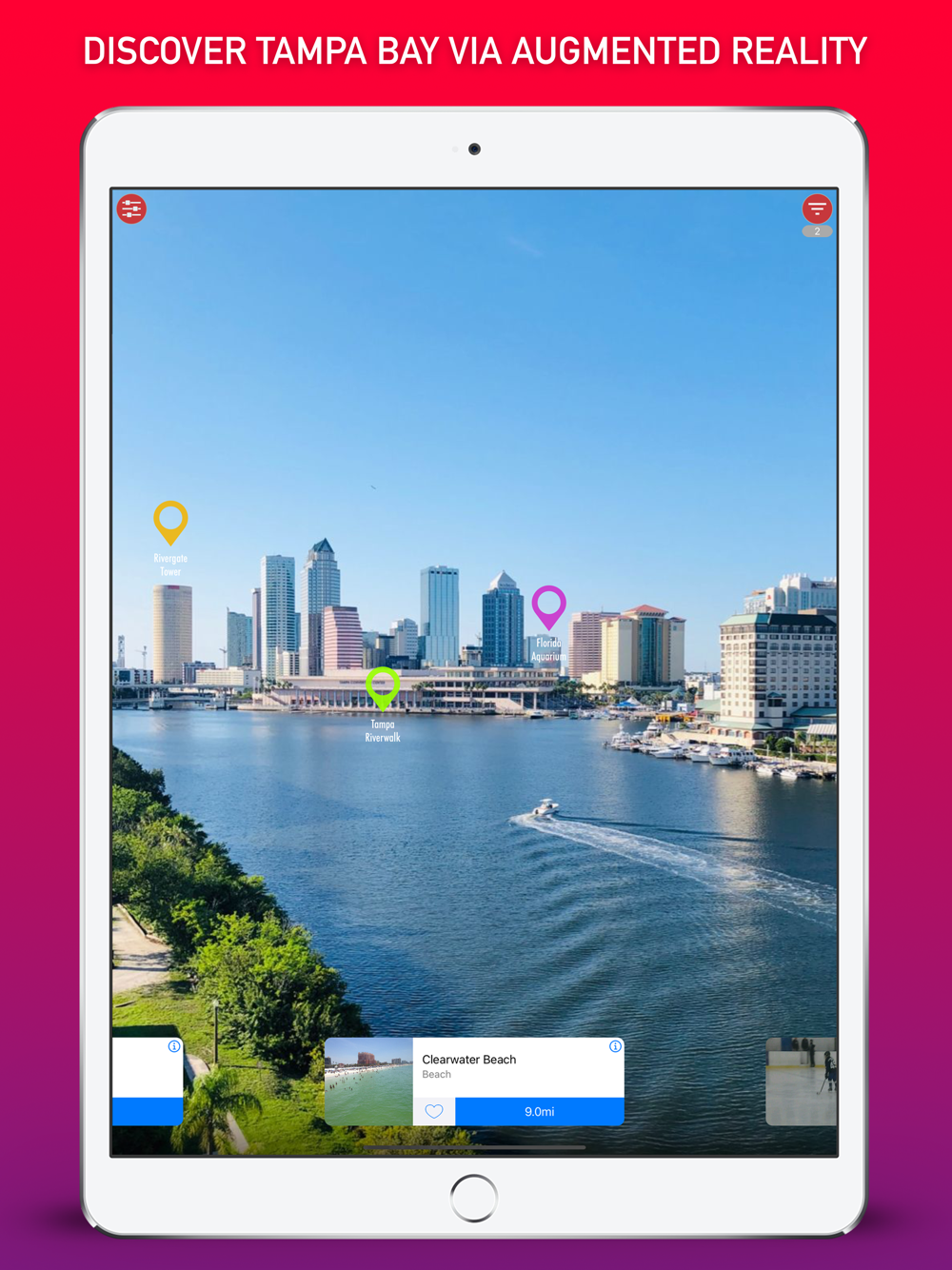 ERLEBEN SIE TAMPA BAY auf eine neue, futuristische Weise, indem Sie in die Kamera Ihres Telefons schauen, um alle beliebtesten Sehenswürdigkeiten in Ihrer Umgebung zu finden. 360 TB ist eine Augmented Reality (AR)-App, die Orte anzeigt, die Sie überall dort finden möchten, wo Sie das Telefon hinrichten.
