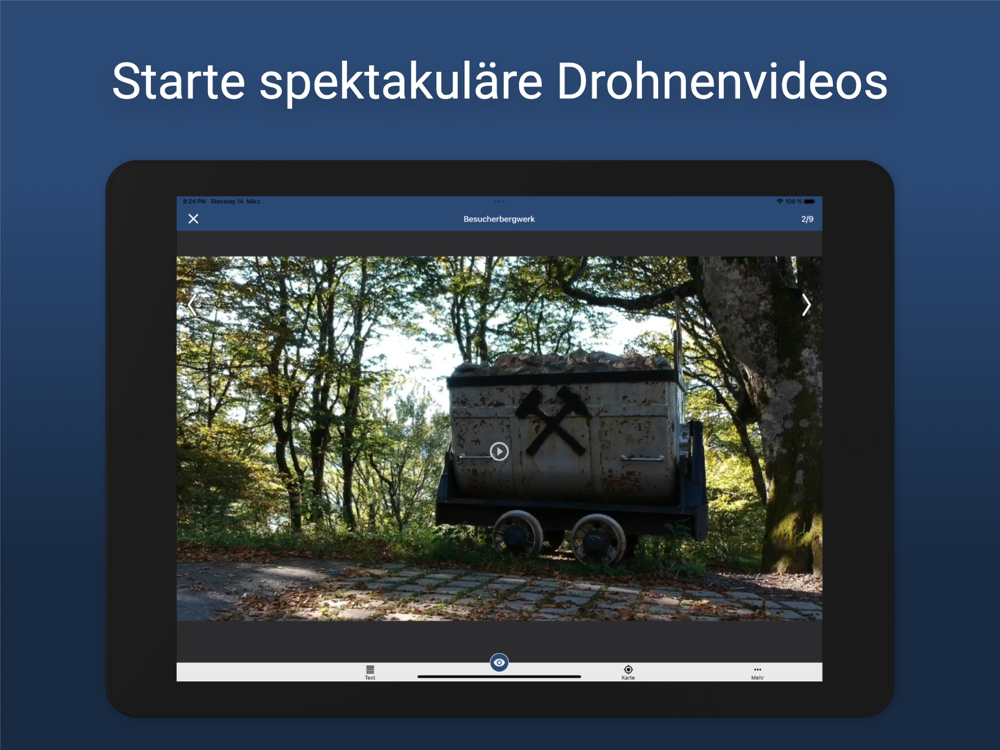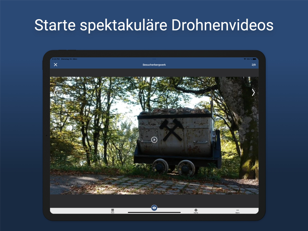 Stationen und Wege am Schauinsland, die auf Grund steiler Zwischenpassagen nicht für Besucher*innen mit eingeschränkter Mobilität geeignet sind, können in der App durch den Aufruf von Drohnenflug Videos virtuell erkundet werden.