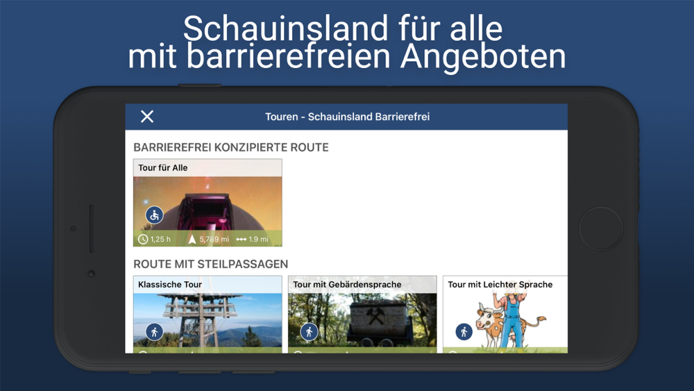So wird ein Ausflug in das Museumsbergwerk ermöglicht oder der Blick führt hoch hinauf in eine Weidbuche. Ohne mühsamen Aufstieg kann der Rundumblick vom Turm genossen werden oder ein virtueller Besuch des Sonnenobservatoriums entführt in ferne Sphären. Die App umfasst außer einer barrierefreien Route am Schauinsland auch Angebote in Leichter Sprache und Gebärdensprache.