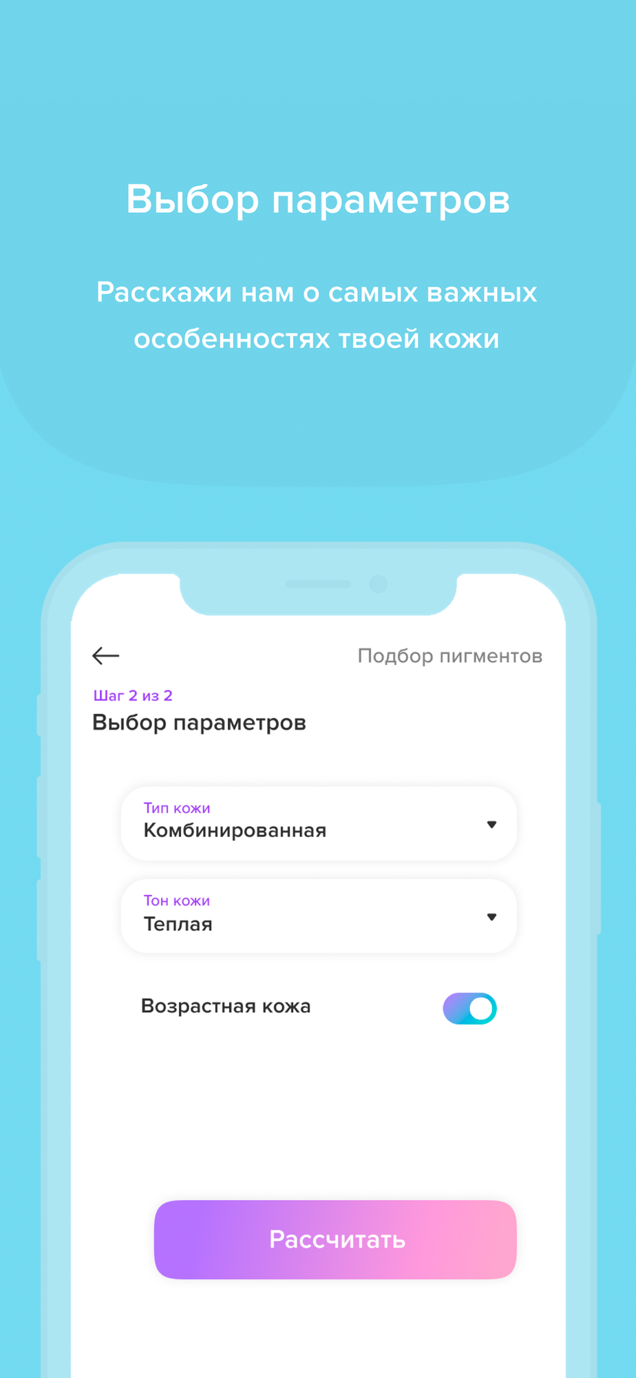 Как только Вы загрузите в него селфи своего клиента, приложение начнет анализировать фотографию и задаст несколько вопросов про тип кожи клиента. С помощью этих данных оно проводит полный анализ и предлагает несколько вариантов на выбор, пигментов, которые можно применить данному клиенту , а так же предложит продукты, которые вам необходимы для работы.