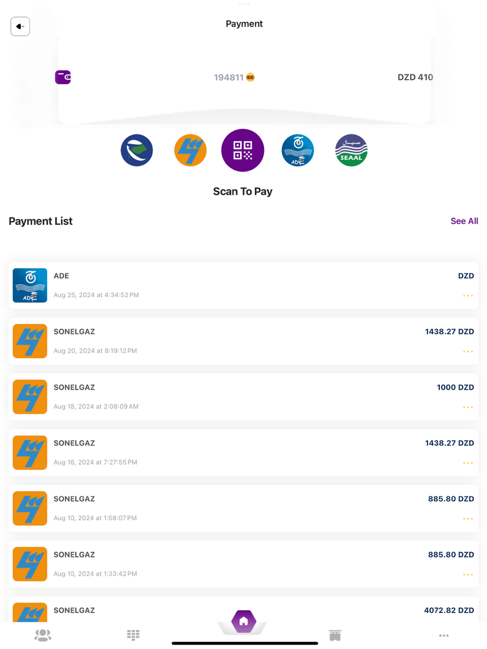 Pay your purchases and utility bills directly within the app, including Idoom ADSL, 4G of Algérie Télécom, Sonelgaz, ADE, and Seaal. Just scan the QR code to initiate fast, safe payments.