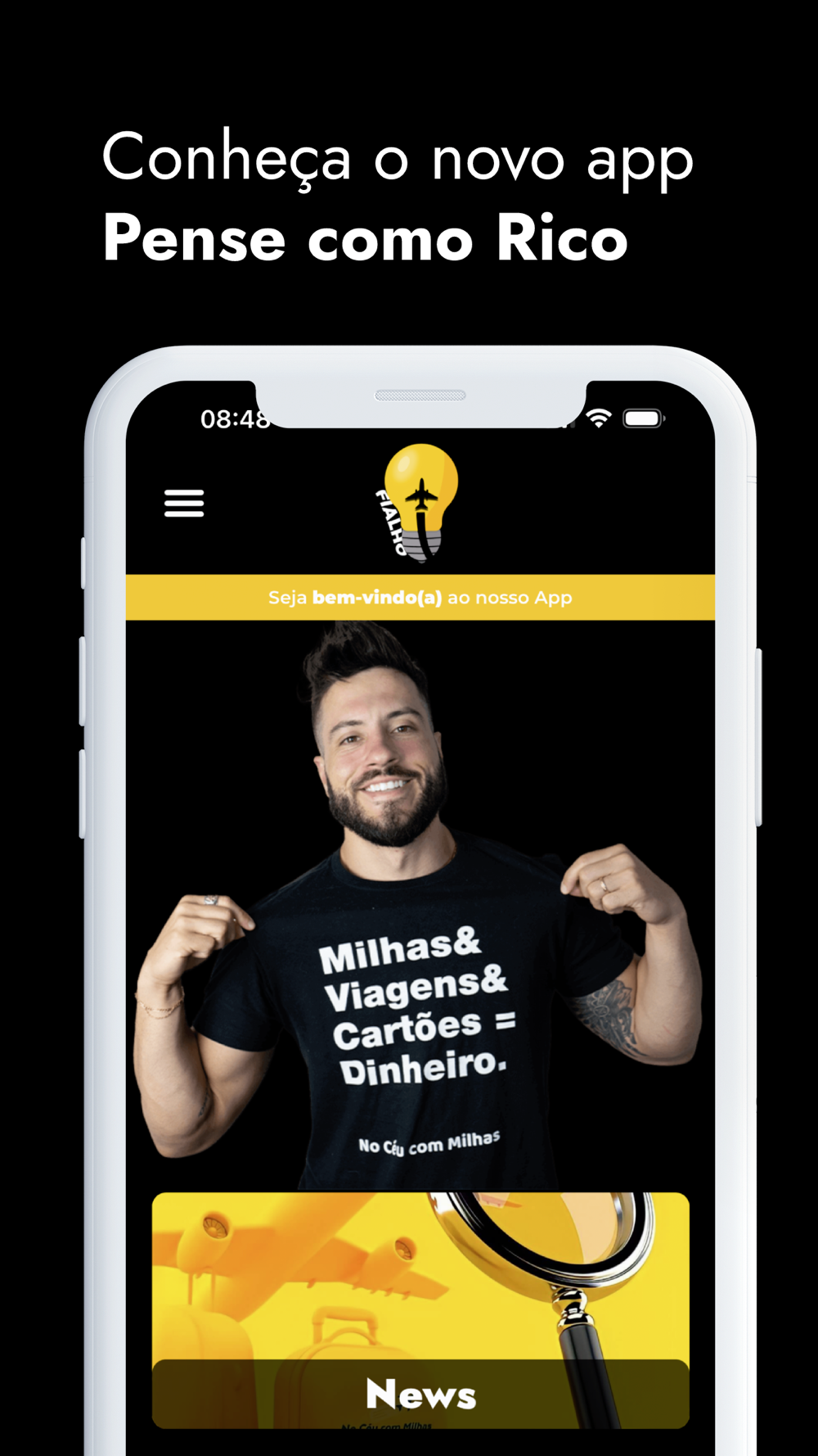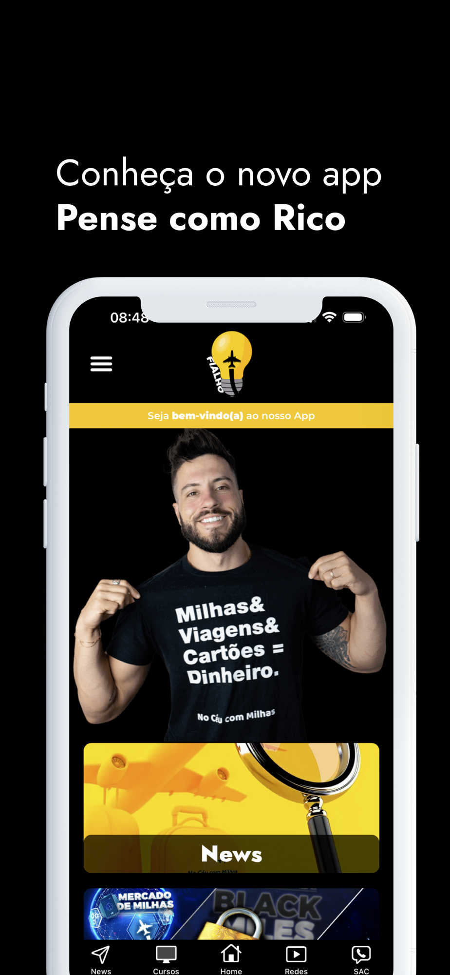 Com o app Pense Como Rico, você encontrará nossos cursos, feed com novidades exclusivas e mais. O nosso objetivo é ensinar os brasileiros a ganharem mais dinheiro, a investirem melhor e a viajarem mais! Bora pra cima!